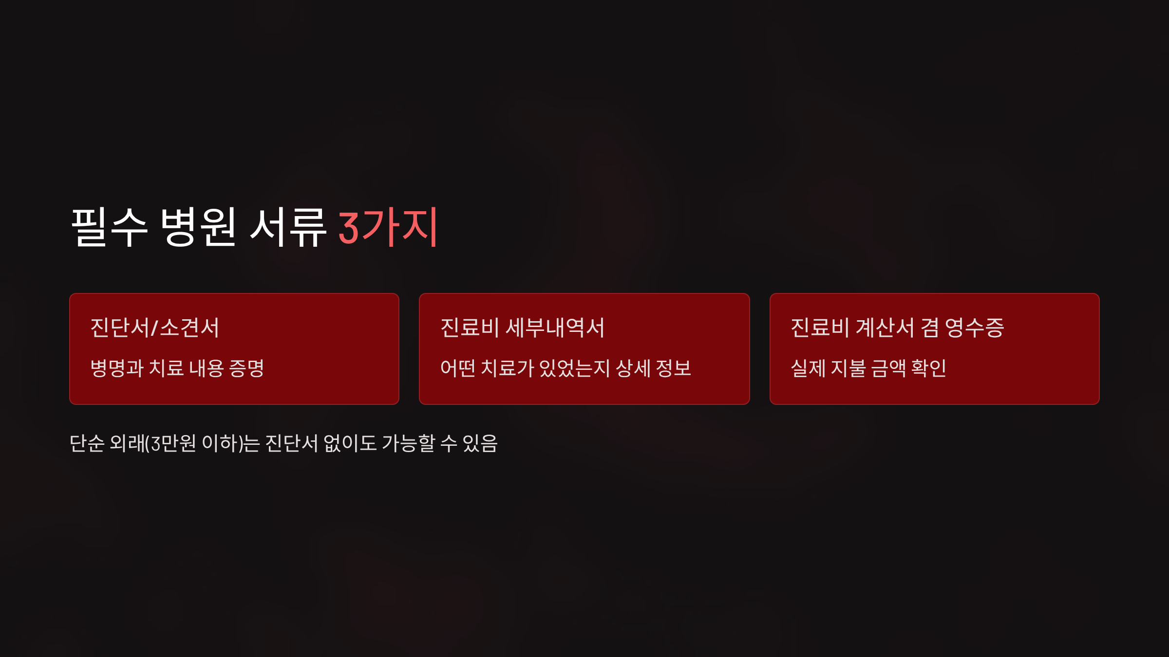 단순 외래 진료(3만 원 이하)나 약국 방문 등은 진단서 없이도 가능할 수 있어요. 이 경우 영수증과 세부내역서만으로 충분하다고 안내하는 보험사도 있답니다.