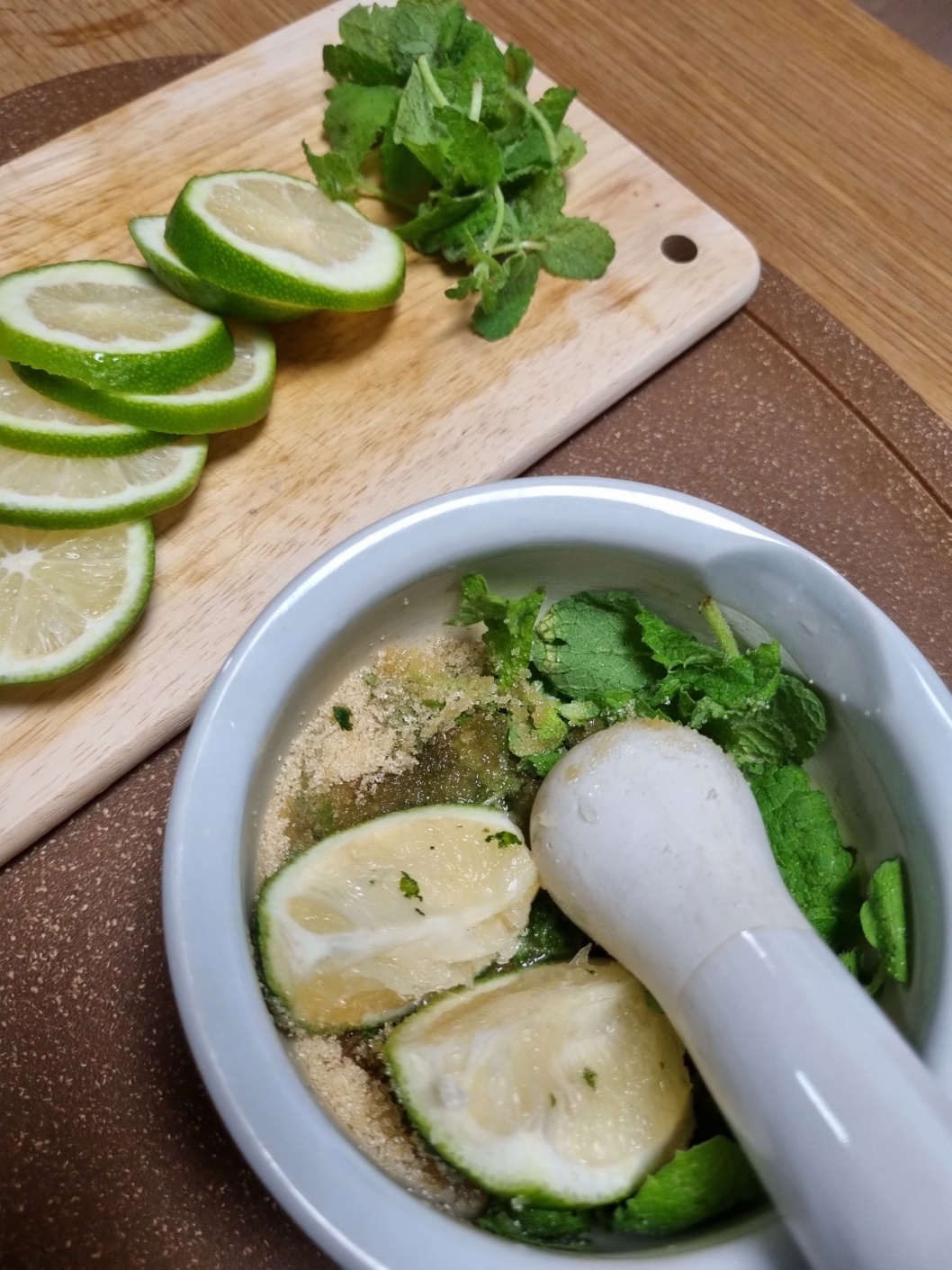라임맛이 진하게 우러나지 않기 때문에 미리 1/2조각은 설탕과 애플민트도 2/3 정도를 같이 절구로 어느 정도