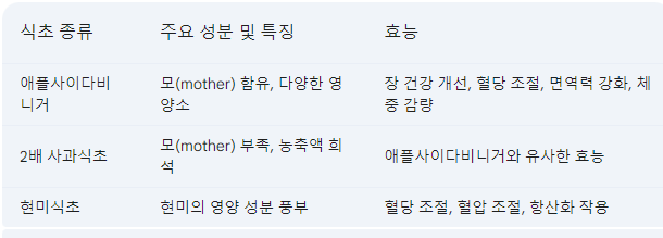 애플사이다비니거(애사비), 2배 사과식초, 현미식초는 모두 식초 종류이지만, 원료와 제조 과정에 따라 약간의 차이가 있습니다. 각 식초의 효능과 성분에 대해 자세히 알아볼까요?
