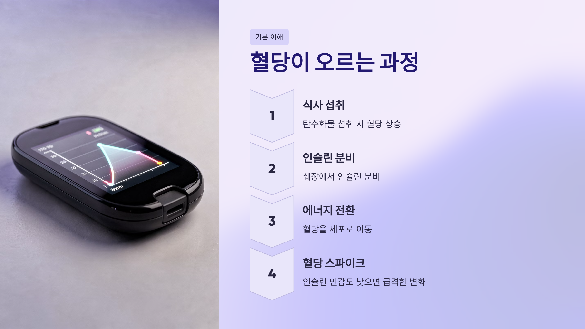 우리가 식사를 하면 혈당(포도당 수치)이 상승합니다. 특히 탄수화물이 많을수록 혈당은 빠르게 오르죠.