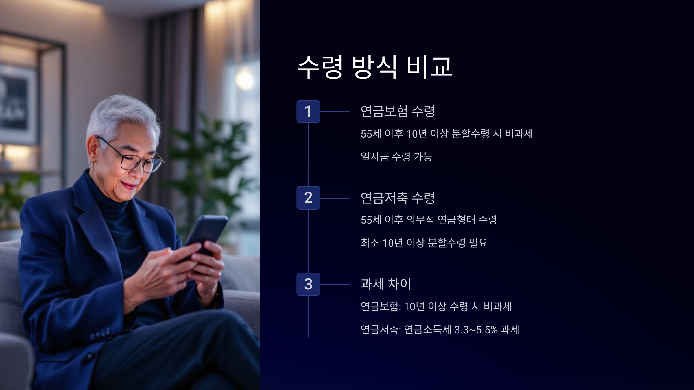 | 수령 조건 | 55세 이상, 5년 이상 | 제한 없음 |