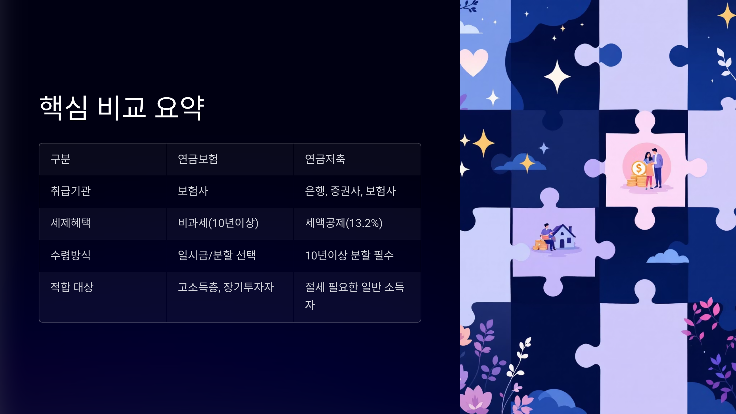 반대로, 안정적인 노후 준비가 목표고, 세금 혜택보다 보장성과 유연함이 중요한 분이라면 '연금보험'이 어울려요. 특히 소득이 없는 분도 가입 가능하다는 게 장점이에요.