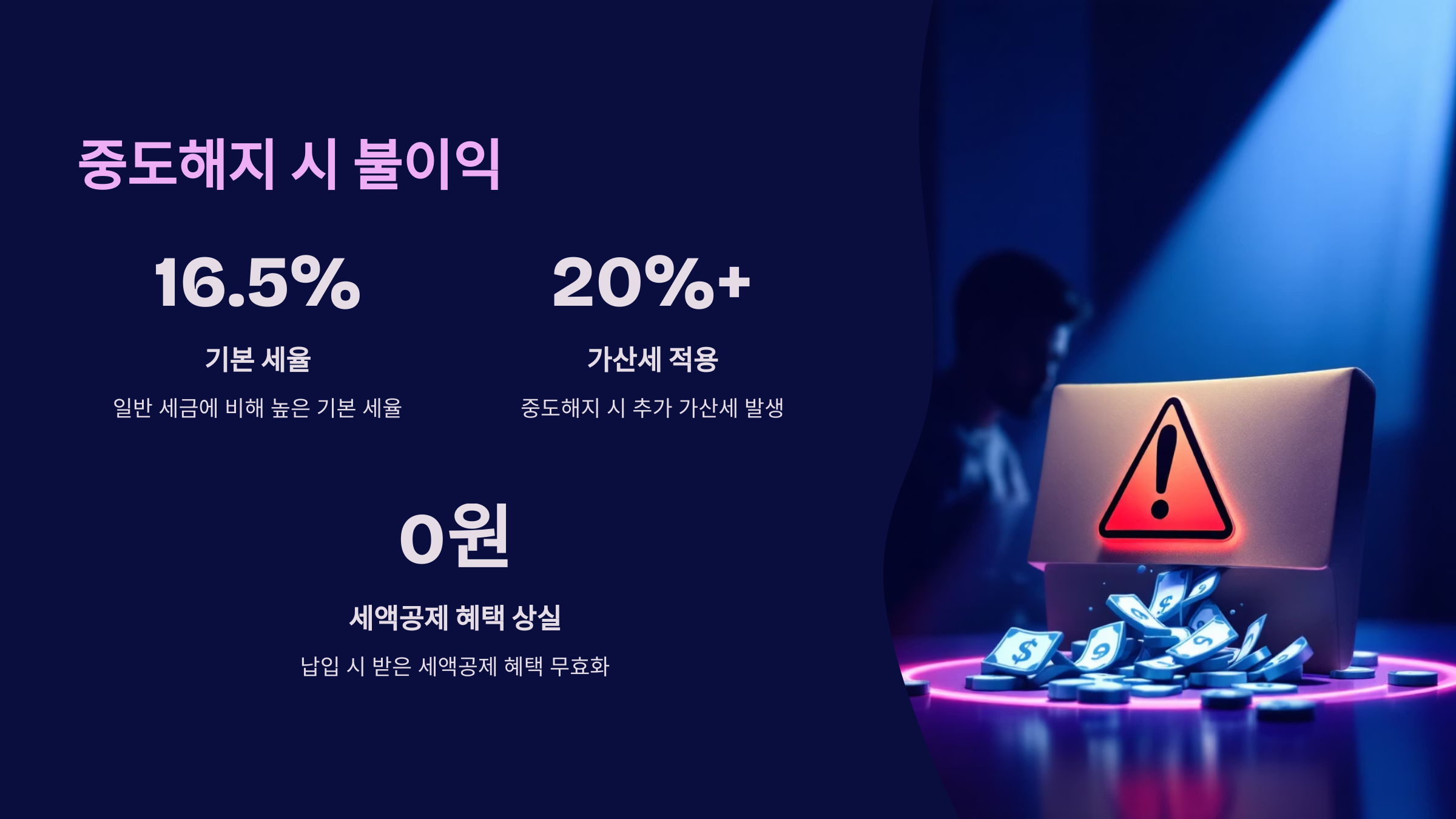 세액공제를 받으며 적립한 금액을 아무 계획 없이 중도에 깨버리면, 정부는 그 혜택을 취소하고 다시 세금을 부과해요. 이게 바로 ‘16.5% 기타소득세’로 불리는 세금이에요.