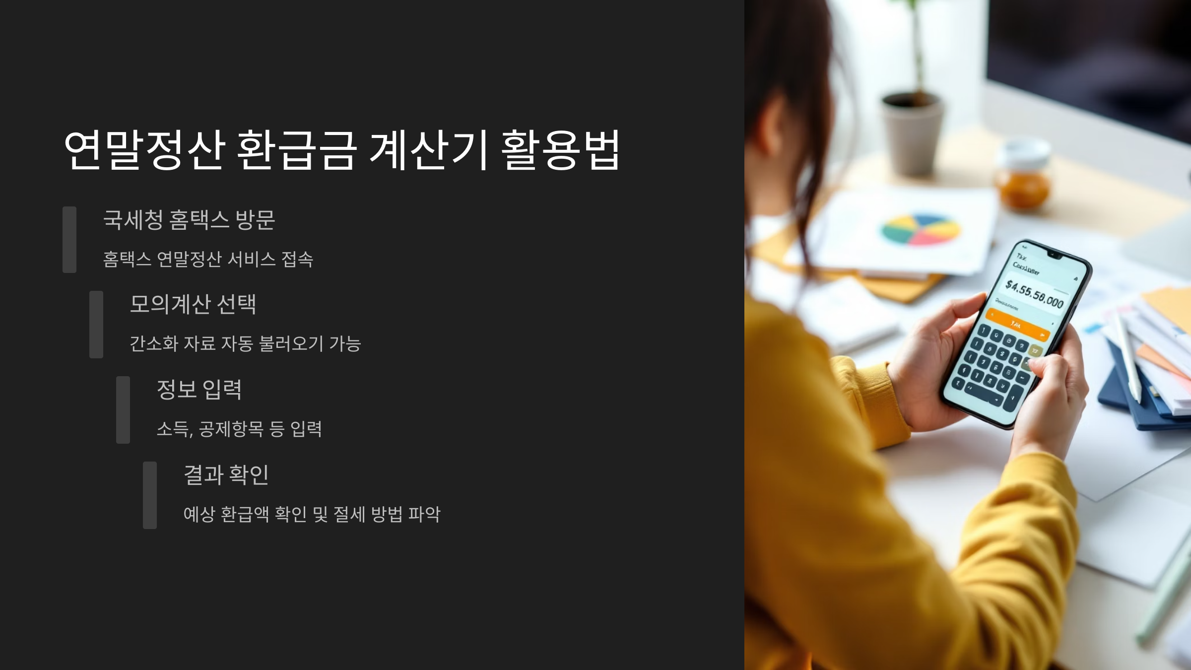홈택스에는 국세청 연말정산 자동계산기가 있어요. 총급여, 부양가족, 공제항목만 입력하면 예상 환급액을 바로 확인할 수 있어요!