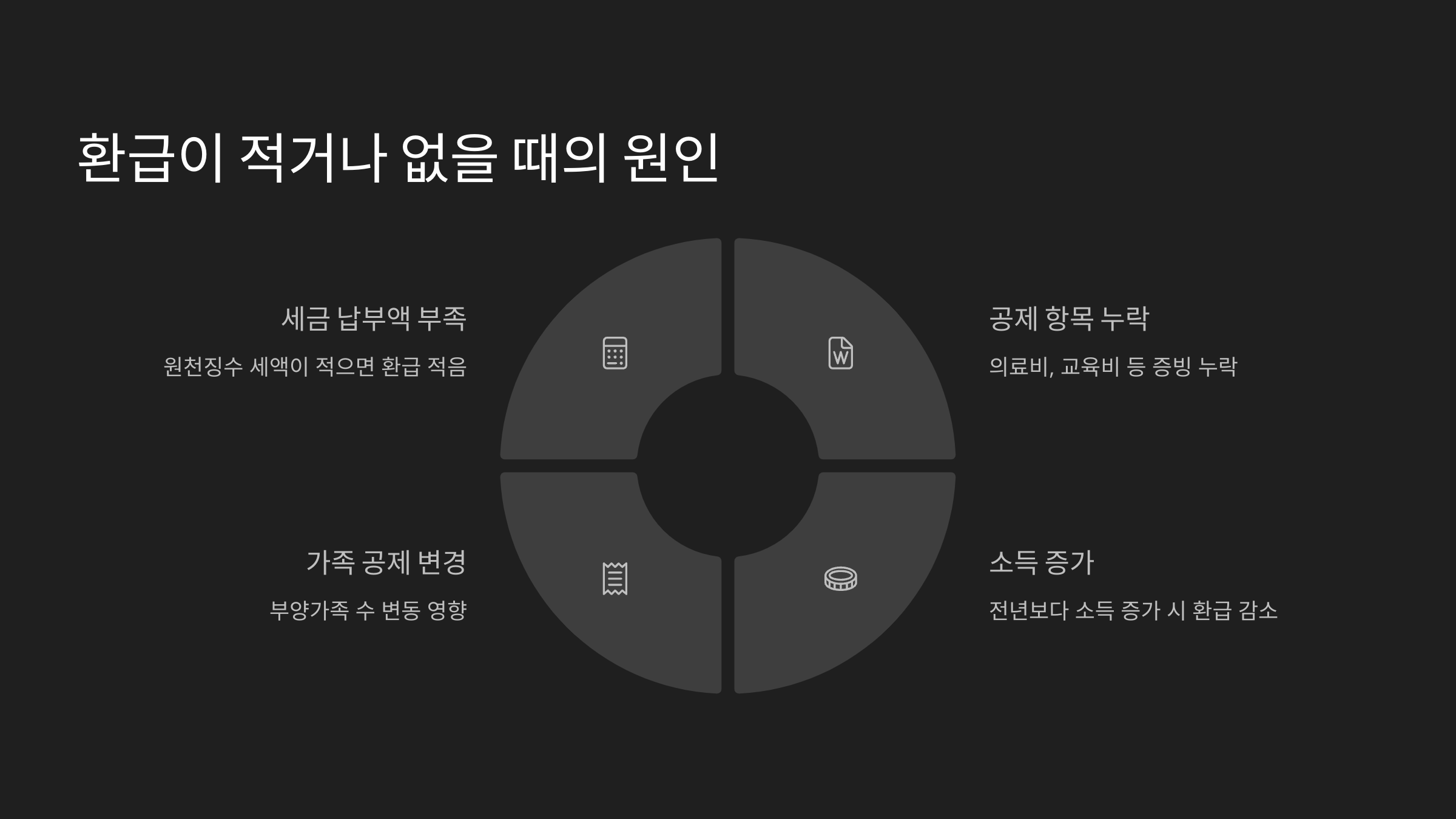 "왜 이리 적지?"라는 말, 많이들 하시죠? 실제로 기대보다 환급액이 적은 경우는 대부분 아래 4가지 이유 중 하나예요.