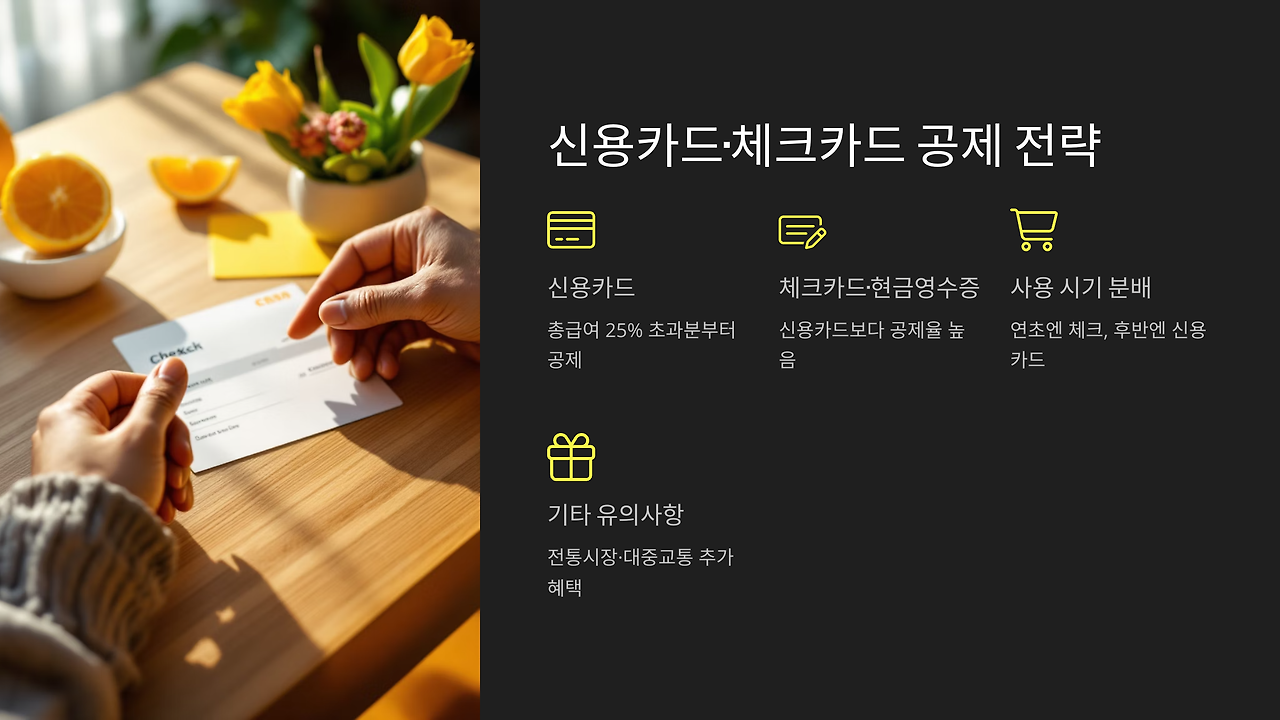 2️⃣ 체크카드·현금 사용 늘리기 신용카드는 공제율 15%지만 체크카드는 30%! 연말에 몰아서 사용하면 공제액 확 올라가요.