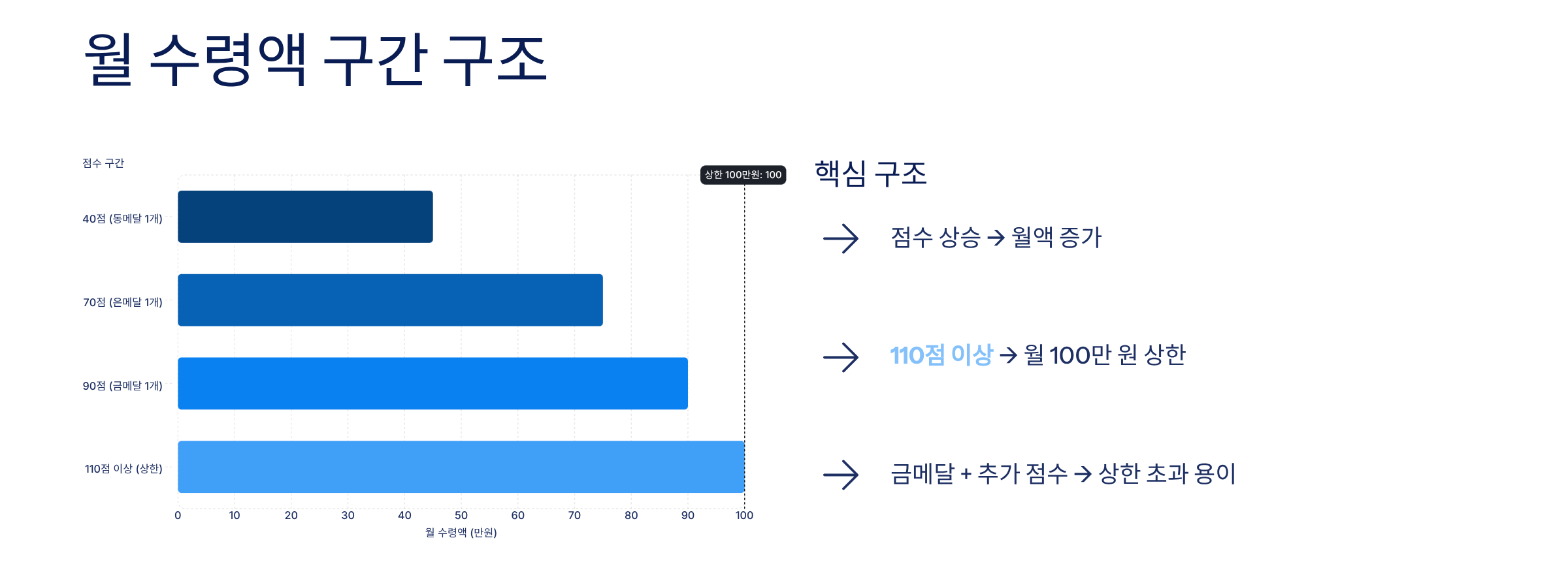 상한 110점 이후에는 월액 증가가 없어요. 대신 초과 점수는 일시 보상으로 환산돼요. 그래서 금메달 2개라도 월액은 동일해요. 추가 보상 방식이 달라요.