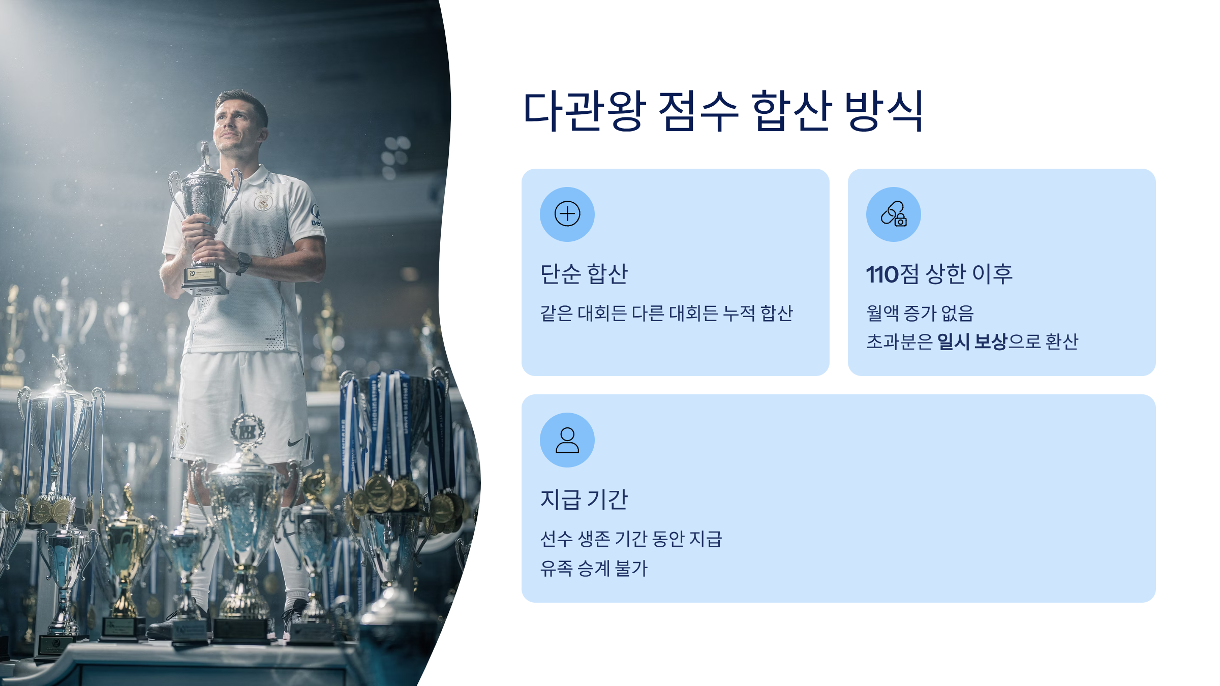 상한을 초과한 점수는 월 지급액에 더해지지 않아요. 대신 일시 장려금 형태로 전환될 수 있어요. 그래서 다관왕은 추가 보상이 생겨요. 구조가 나뉘어 있어요.