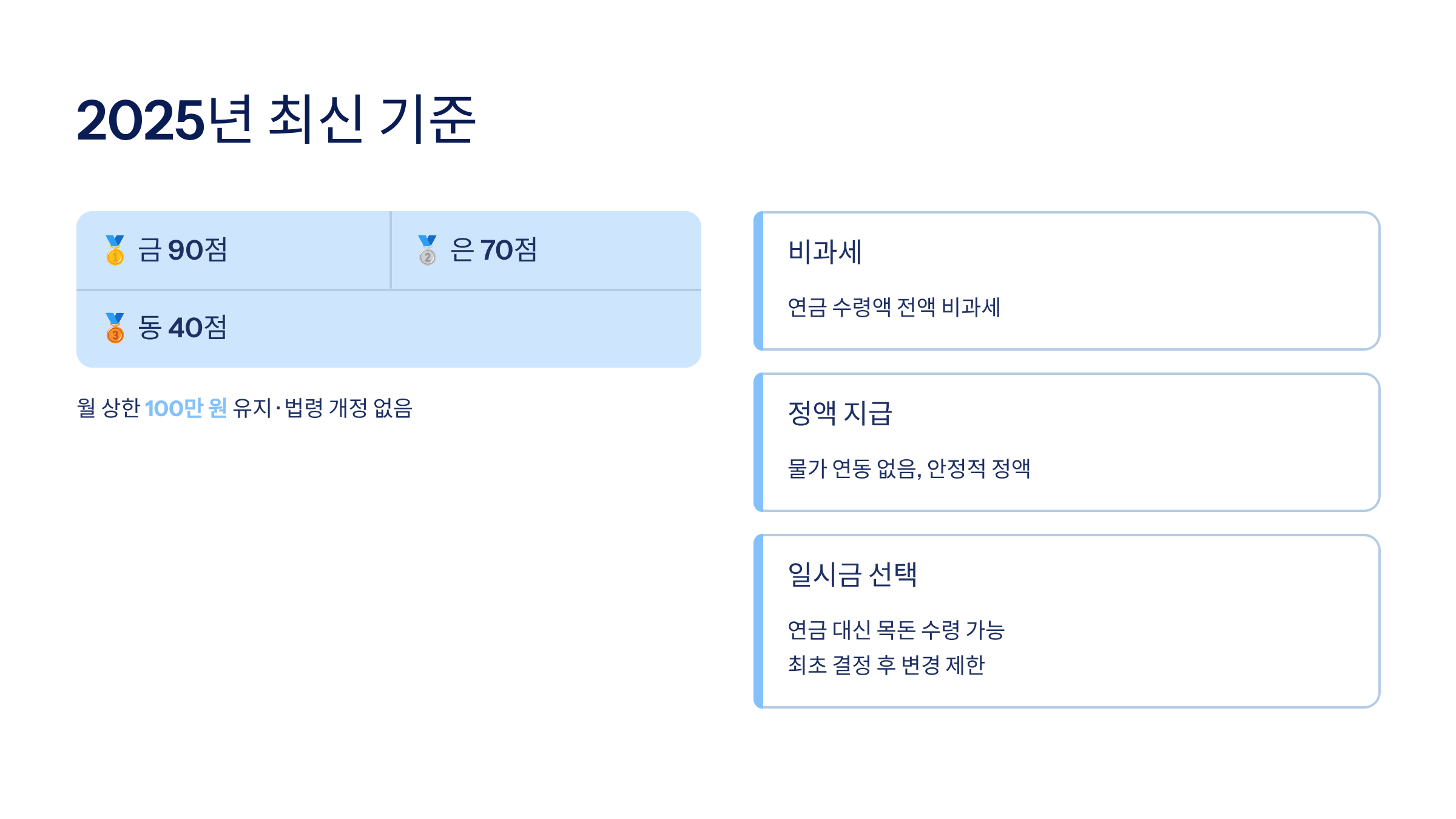 2025년 현재 점수 기준은 유지되고 있어요. 금 90점, 은 70점, 동 40점 구조예요. 월 상한 100만 원도 동일해요. 법령 개정은 없어요.
