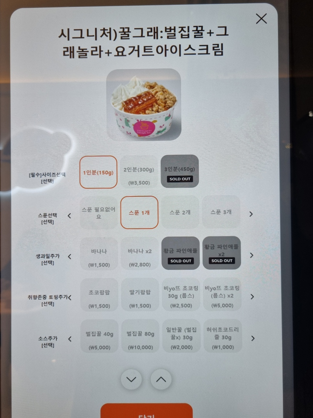 요아정의 메뉴는 기본적으로 요거트 아이스크림과 그릭 요거트로 나뉩니다. 저는 처음 방문이라 추천 조합을 선택했는데요, 이 조합은 요거트 아이스크림에 그레놀라와 벌집 꿀이 들어간 시그니처 메뉴입니다. 가격은 9,500원으로, 내 맘대로 원하는 토핑을 추가할 수도 있습니다. '내맘대로 요아정'을 선택하면 제철 과일이나 다른 다양한 토핑을 추가하여 나만의 요거트 아이스크림을 만들 수 있습니다.
