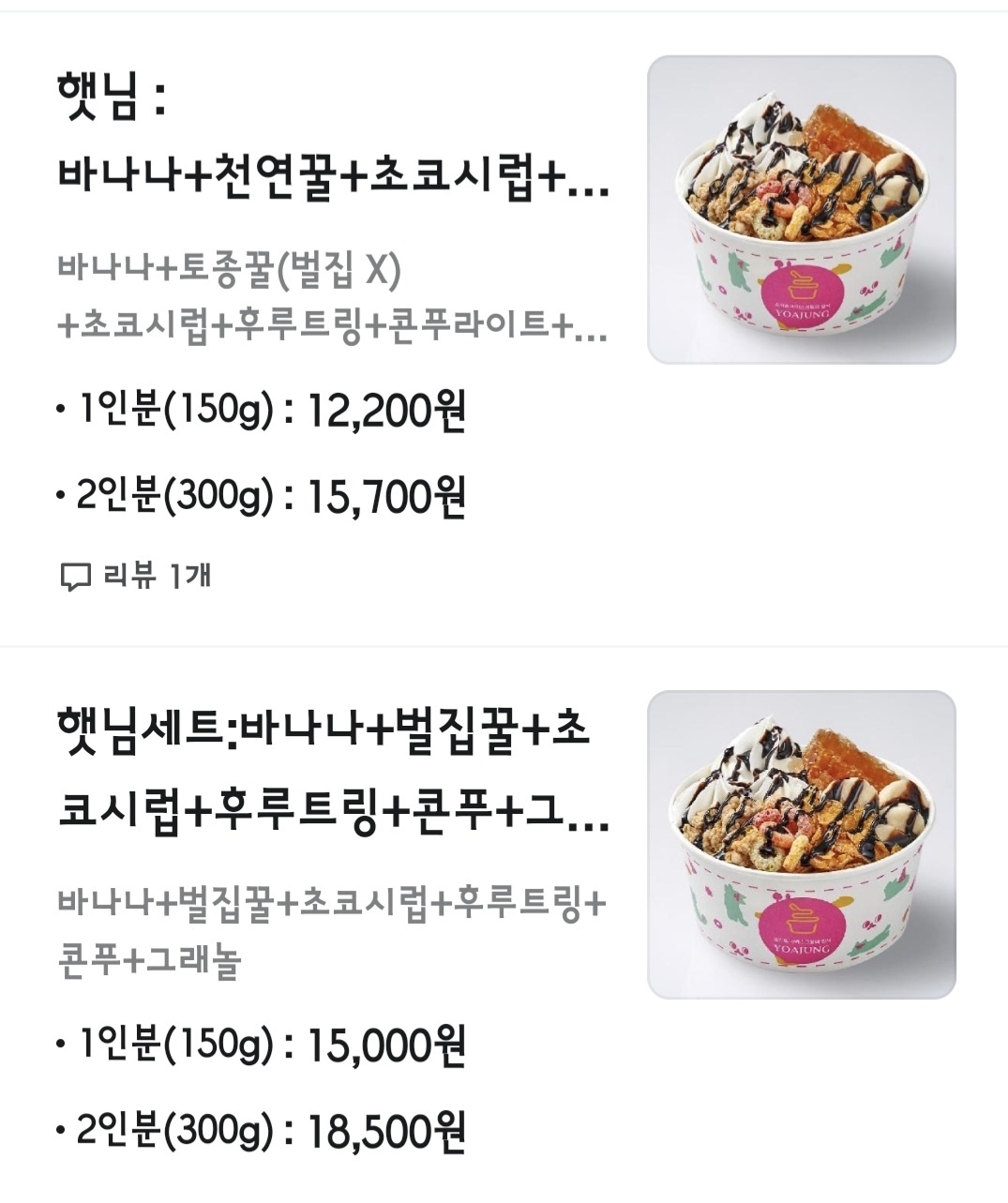 집에 돌아와 배달 앱을 확인해 보니, 요아정의 인기 조합들이 메뉴로 많이 등록되어 있더군요. 특히, 연예인 강민경과 입짧은햇님 조합이 눈에 띄었습니다. 이 조합들은 배달 앱에서도 많은 인기를 끌고 있으며, 특히 강민경 조합은 자몽, 첵스초코, 벌집 꿀, 연유로 구성되어 상큼함과 달콤함이 잘 어우러진다고 합니다. 입짧은햇님 조합은 바나나, 그래놀라, 콘푸라이트, 후루츠링, 벌집 꿀, 초코시럽으로 달콤하고 풍부한 맛을 자랑합니다.