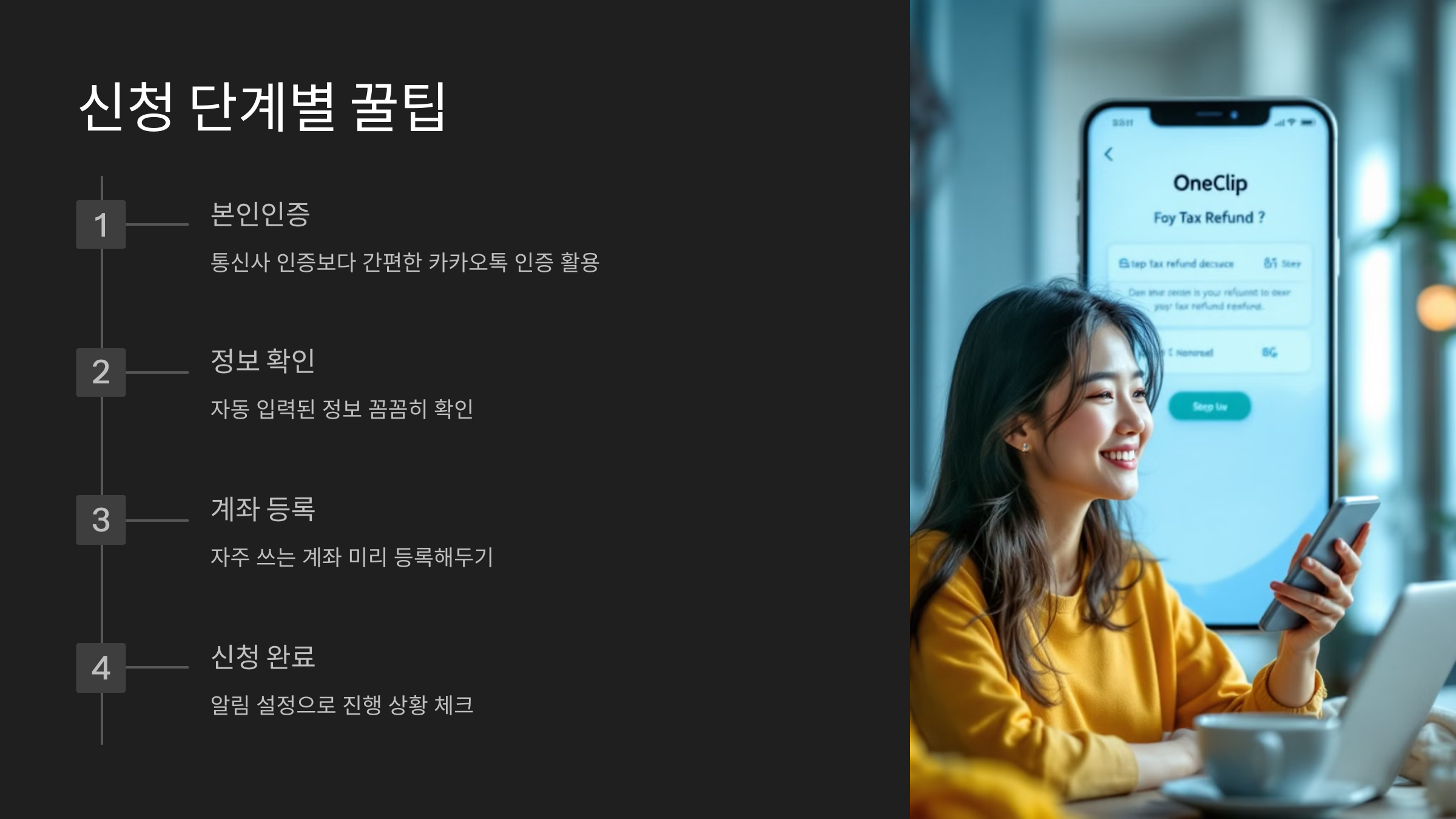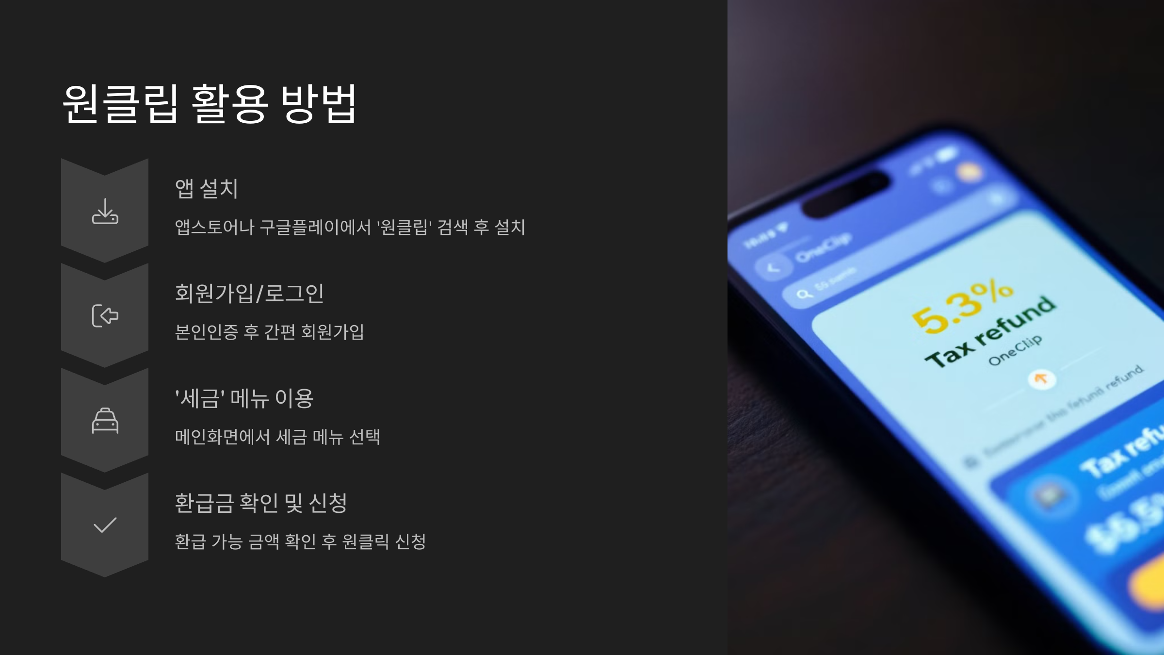 원클립 앱을 이용한 환급 신청은 5단계로 정리할 수 있어요. 여기서 중요한 건 각 단계에서 실수하지 않는 팁이에요. 다음 순서를 참고해보세요! 👇