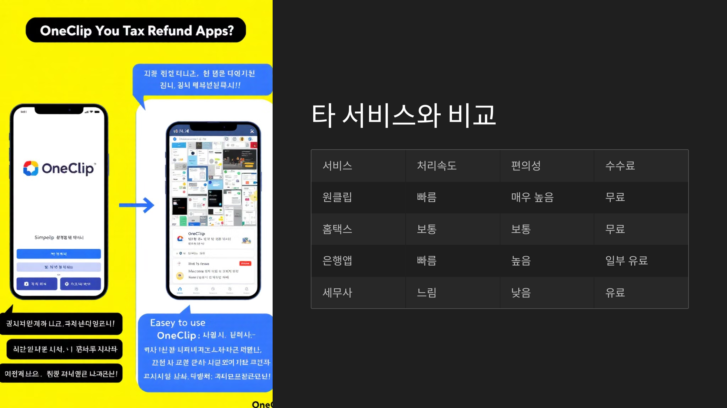 홈택스는 공식 국세청 플랫폼으로 가장 정확하지만, 인터페이스가 어렵고 처음엔 사용하기 좀 복잡하죠. 반면 원클립은 지방세 환급에 특화되어 있고, 조회와 신청이 직관적이에요.