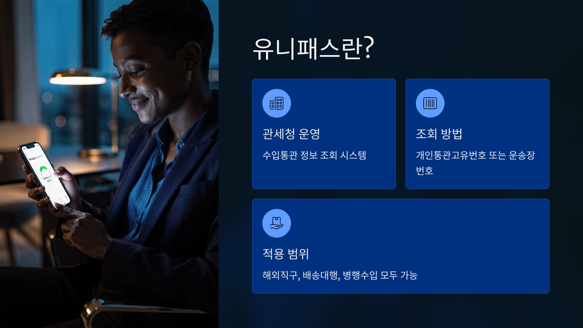 개인통관고유번호 또는 운송장번호로 물품 통관 진행 상태 확인 가능.