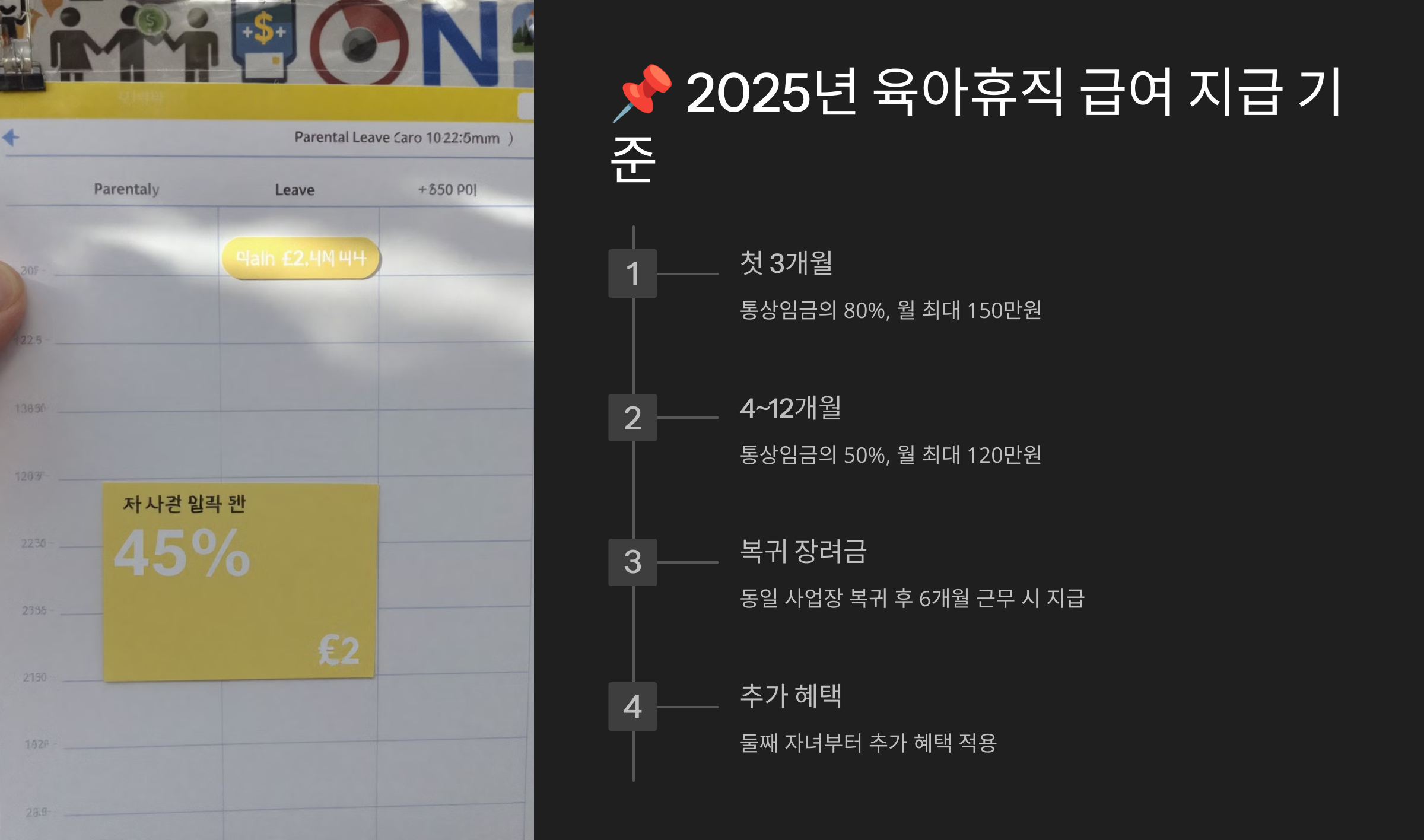 💡 부부가 동시에 육아휴직을 사용할 경우, 첫 3개월 동안 100% 지급이 적용될 수도 있어요! 배우자 육아휴직 보너스제를 확인해보세요. 👨👩👧👦