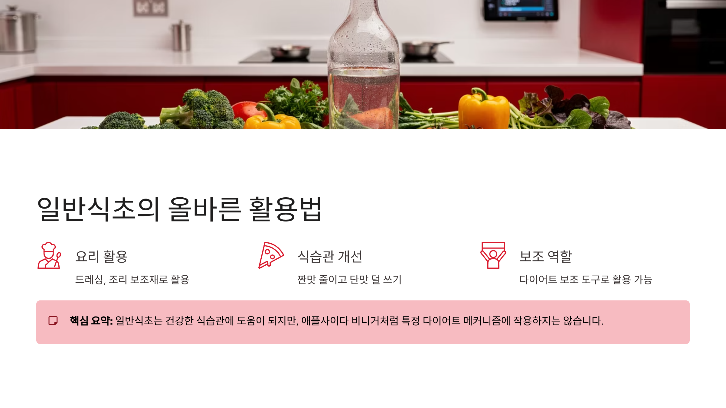 일반식초는 요리나 식습관 개선에는 훌륭한 도구입니다. 드레싱으로 활용하거나, 짠맛을 줄이고 단맛을 덜 쓰기 위한 조리 보조재로도 유익하죠.