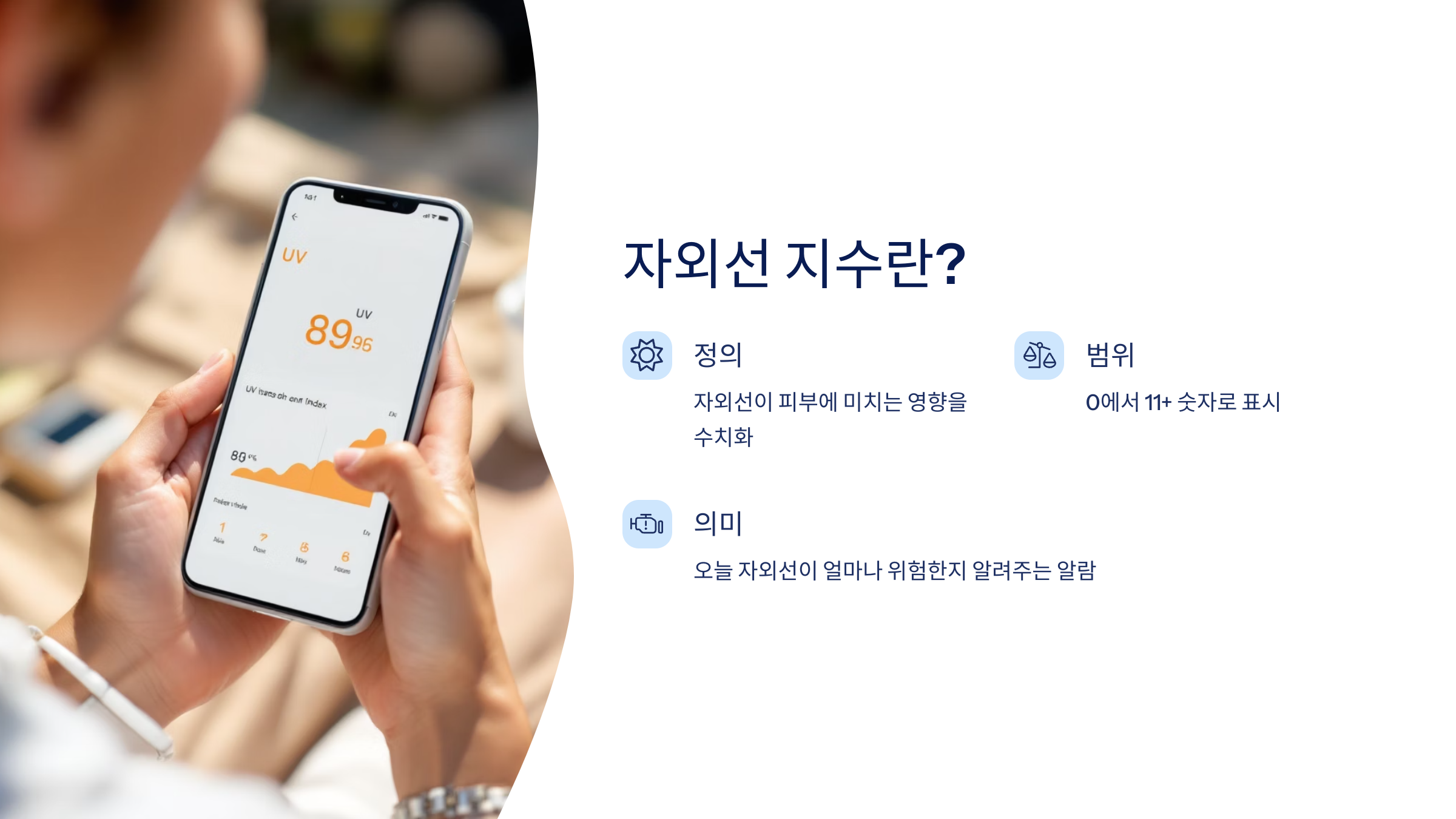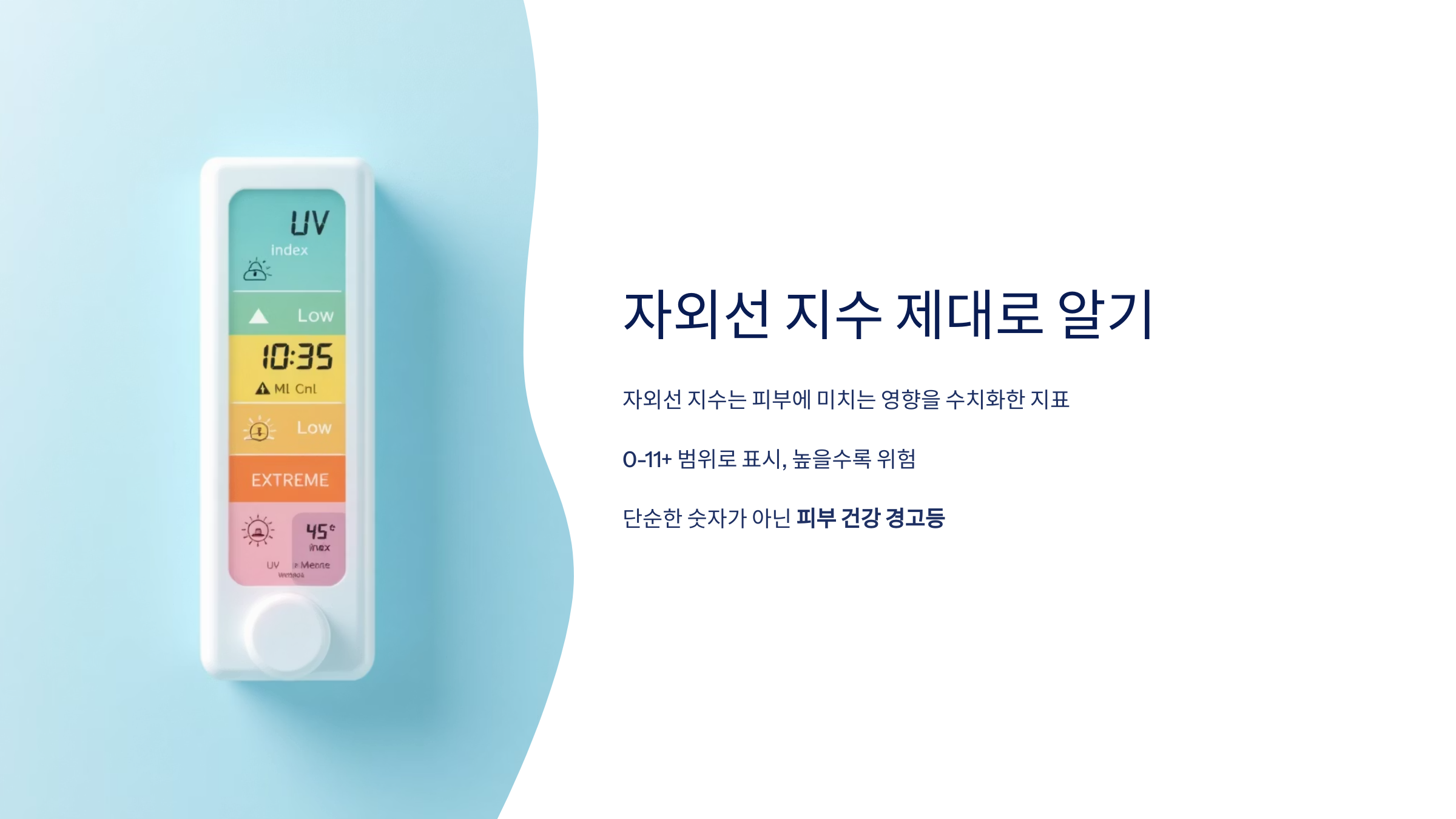 자외선 지수(UVI)는 자외선이 피부에 미치는 영향을 수치화한 지표예요. 0에서 11+까지 숫자로 표시되며, 수치가 높을수록 자외선이 강하다는 뜻이에요. 쉽게 말해, 자외선 지수는 ‘오늘 얼마나 자외선이 세고 위험한지’를 알려주는 알람이에요.