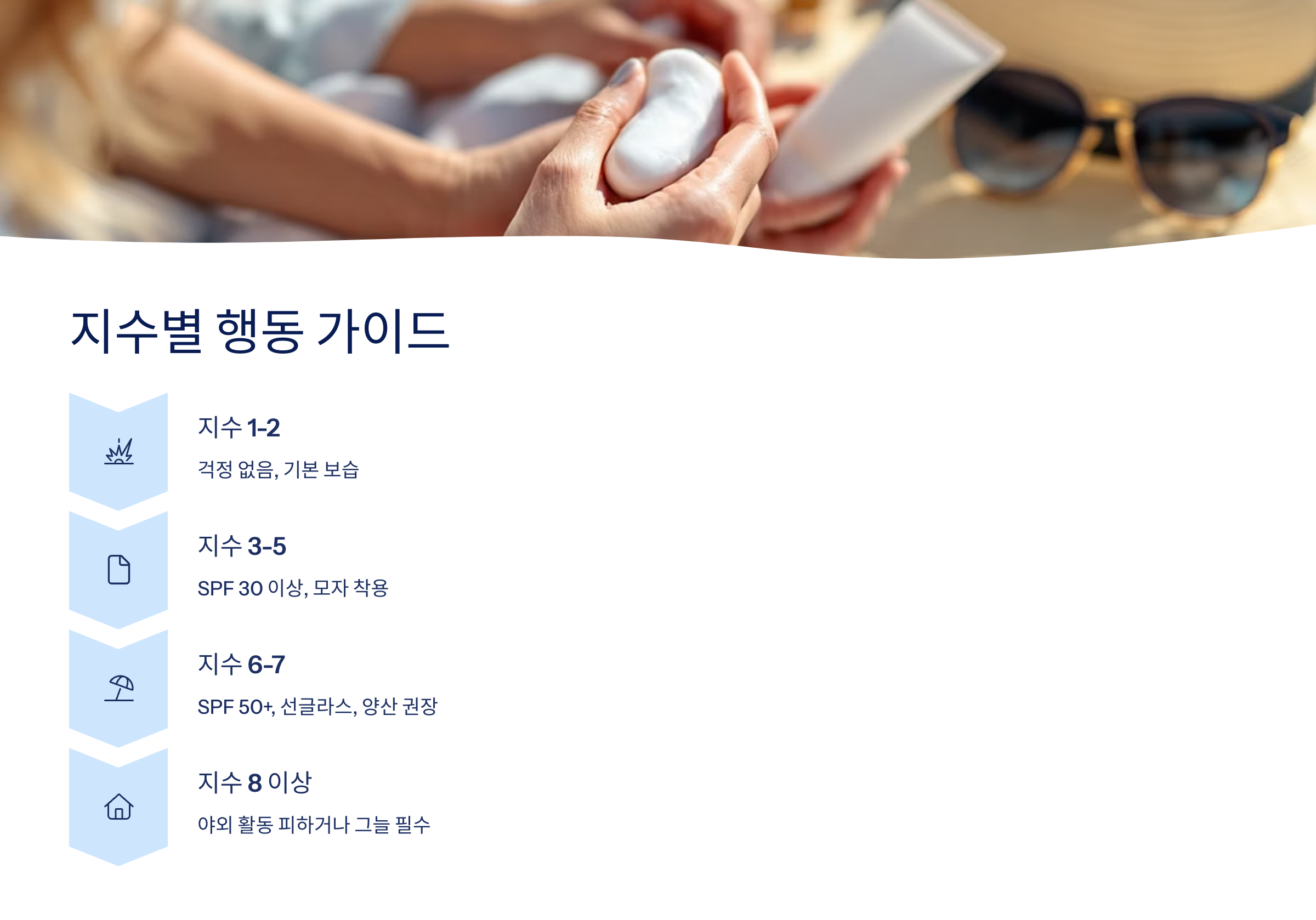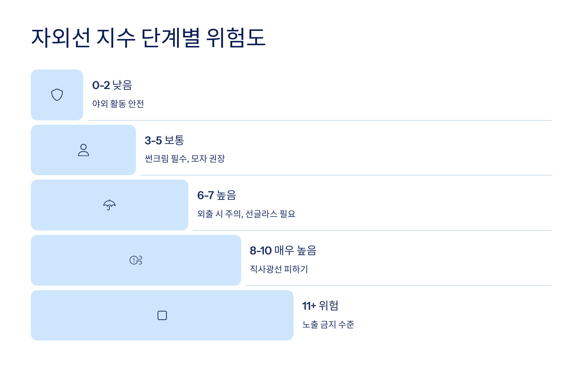 ✔ 자외선 지수가 높을수록 피부 손상 속도도 빨라져요. 아래 기준에 맞춰 매일 대비하세요: