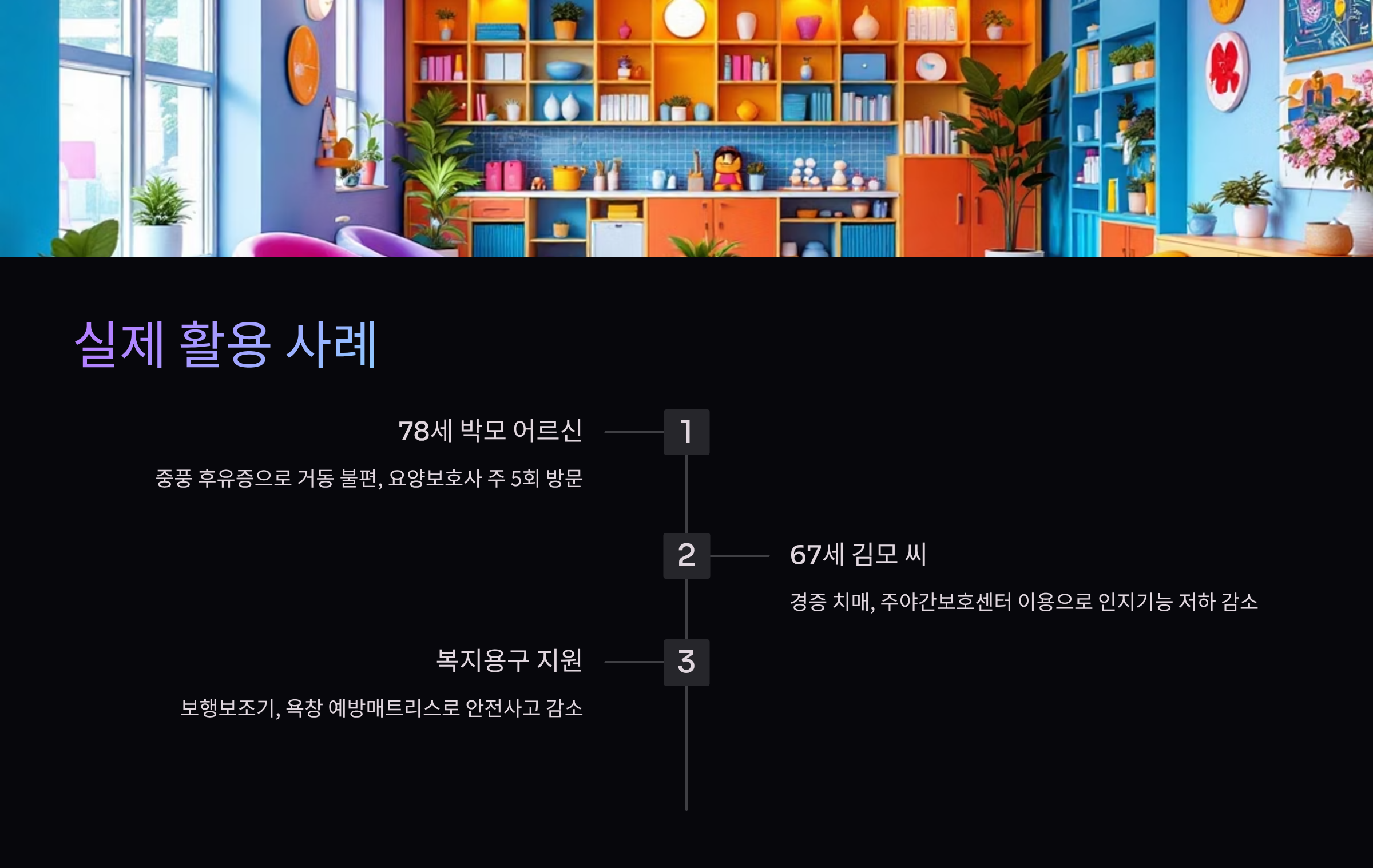 | 중풍 어르신 | 방문요양, 복지용구 | 자택 생활 가능, 가족 부담 감소 |
