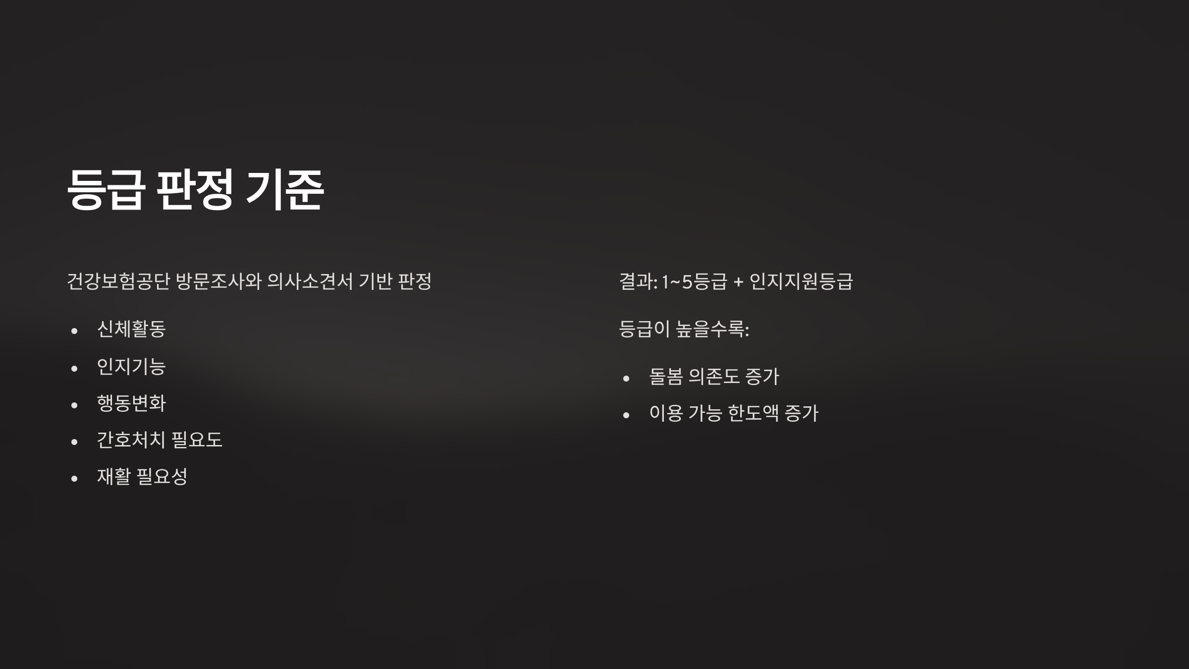 건강보험공단이 방문조사와 의사소견서를 종합해 장기요양인정 점수로 판정해요. 신체활동, 인지기능, 행동변화, 간호처치 필요도, 재활 필요 등을 점수화하고, 결과로 1~5등급과 인지지원등급이 부여돼요. 등급이 높을수록 돌봄 의존도가 크고 이용 가능한 한도액이 커져요.
