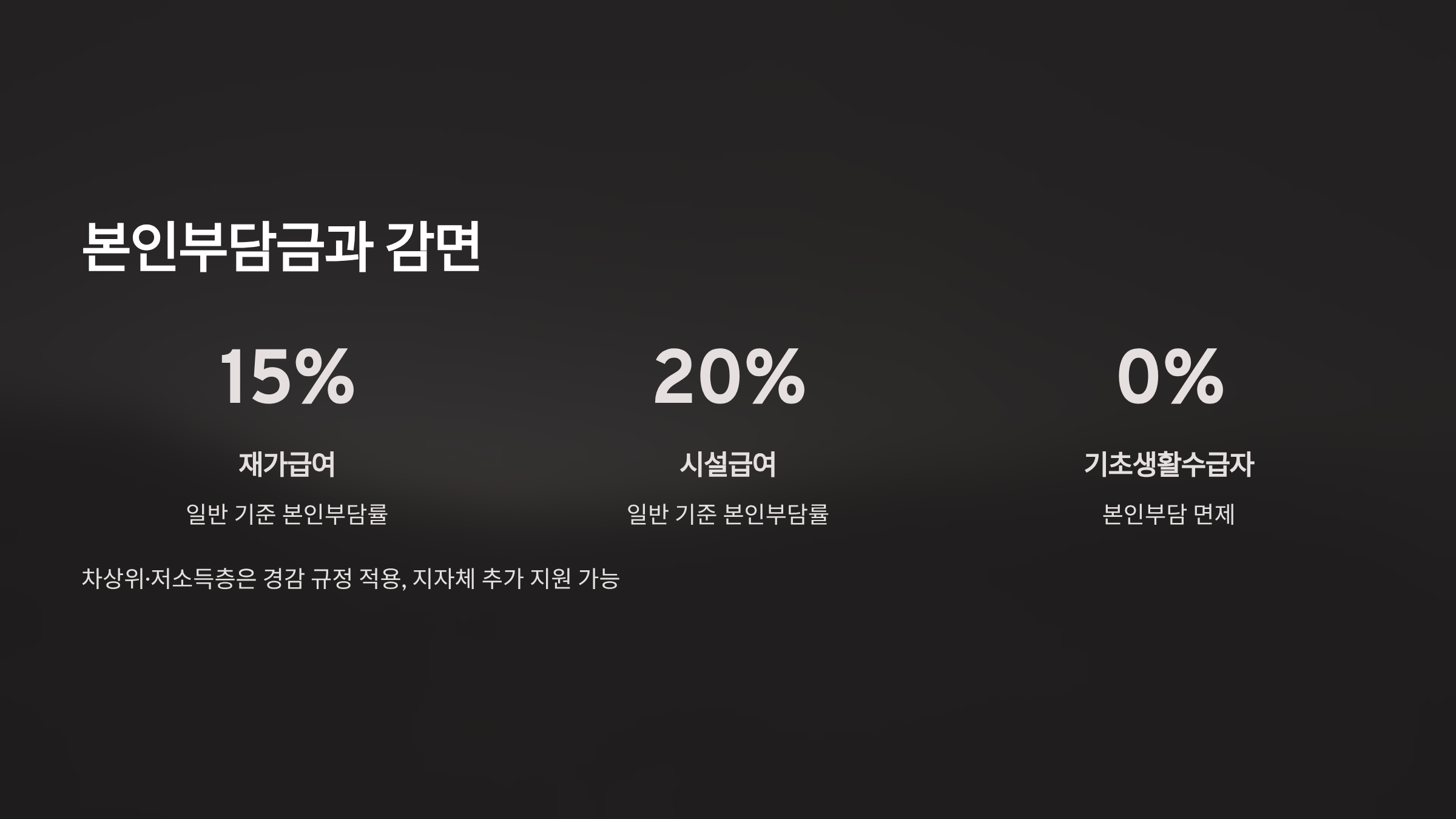 일반 기준으로 재가급여는 15%, 시설급여는 20%를 부담해요. 기초생활수급자는 면제, 차상위·저소득층은 경감 규정이 적용돼요. 지자체 추가 지원 여부에 따라 실부담이 더 낮아질 수 있어요.