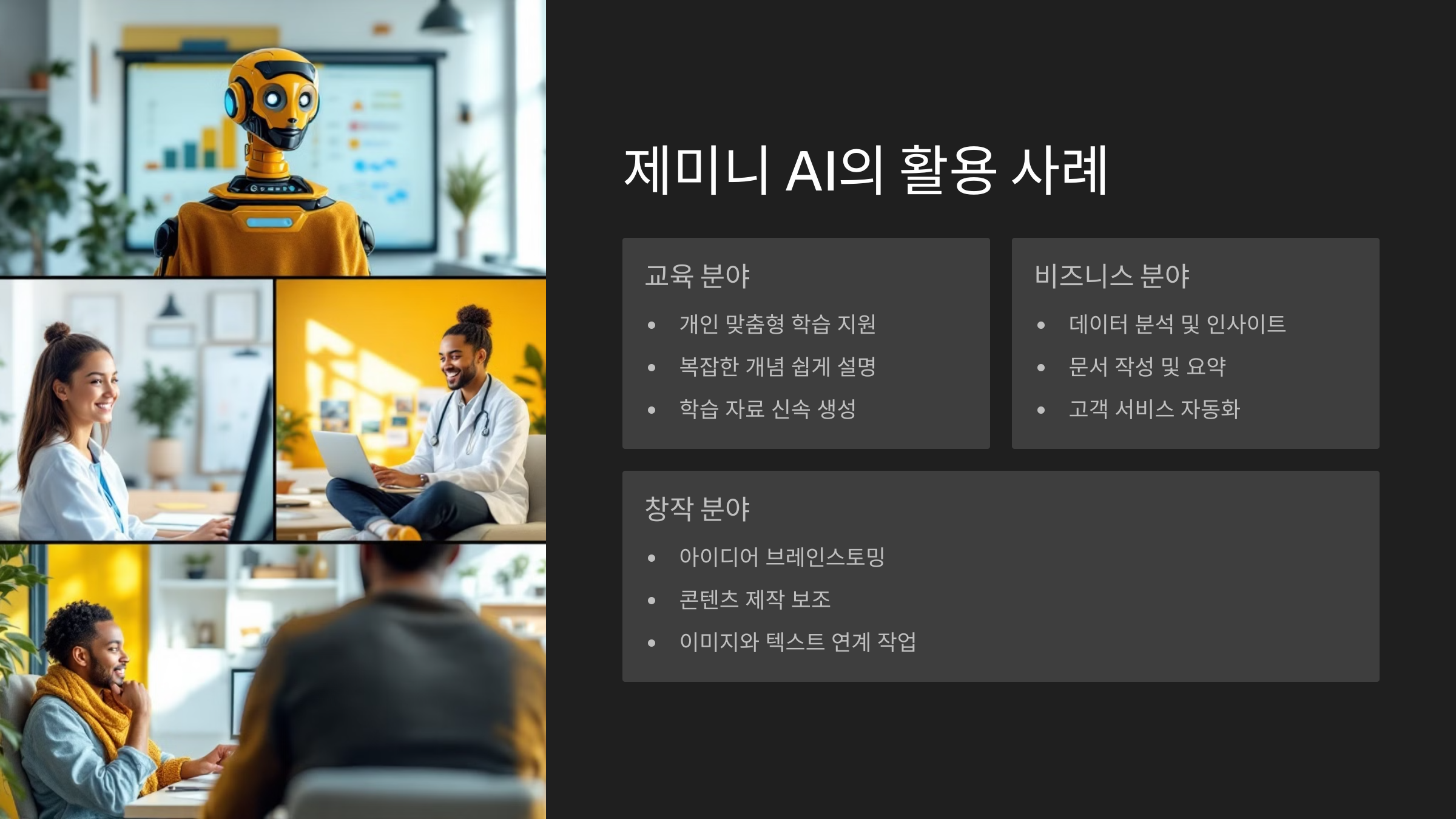 실제 제미니 AI는 일상생활과 업무에 광범위하게 활용되고 있어요. 예를 들어, 유튜브 콘텐츠 아이디어 회의에서 AI에게 “10대 대상 감성 브이로그 제목 10가지”를 요청하면 실시간으로 제안이 나와요. SNS 마케팅을 할 때도 타깃별 전략을 추천받을 수 있죠.