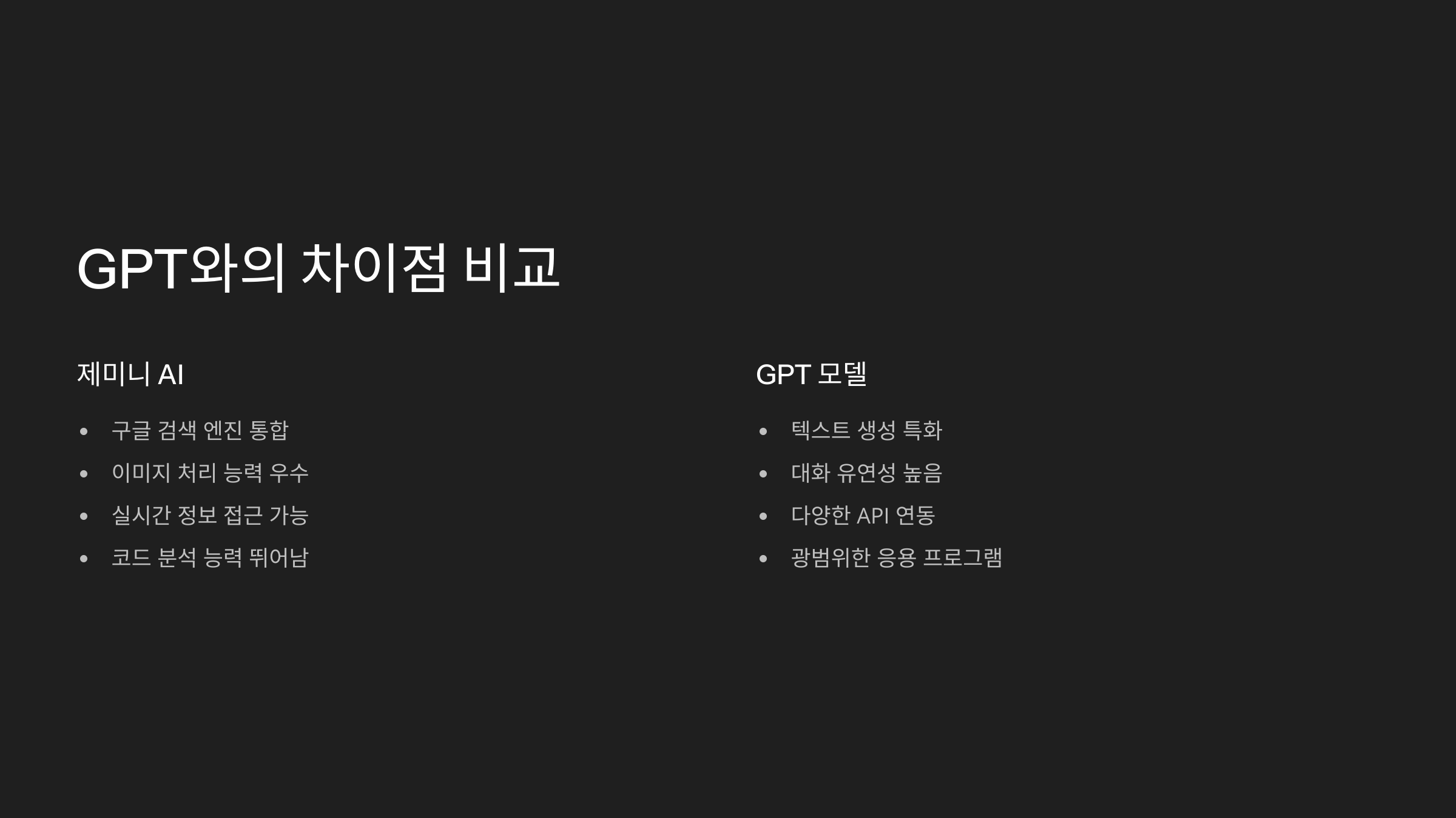 제미니 AI와 GPT 시리즈는 모두 뛰어난 대규모 언어모델이지만, 몇 가지 분명한 차이점이 있어요. 가장 큰 차이는 구글 생태계와의 통합 여부예요. 제미니는 지메일, 구글 드라이브, 유튜브와 연동되면서 실질적인 생산성 도구로 활용될 수 있어요.