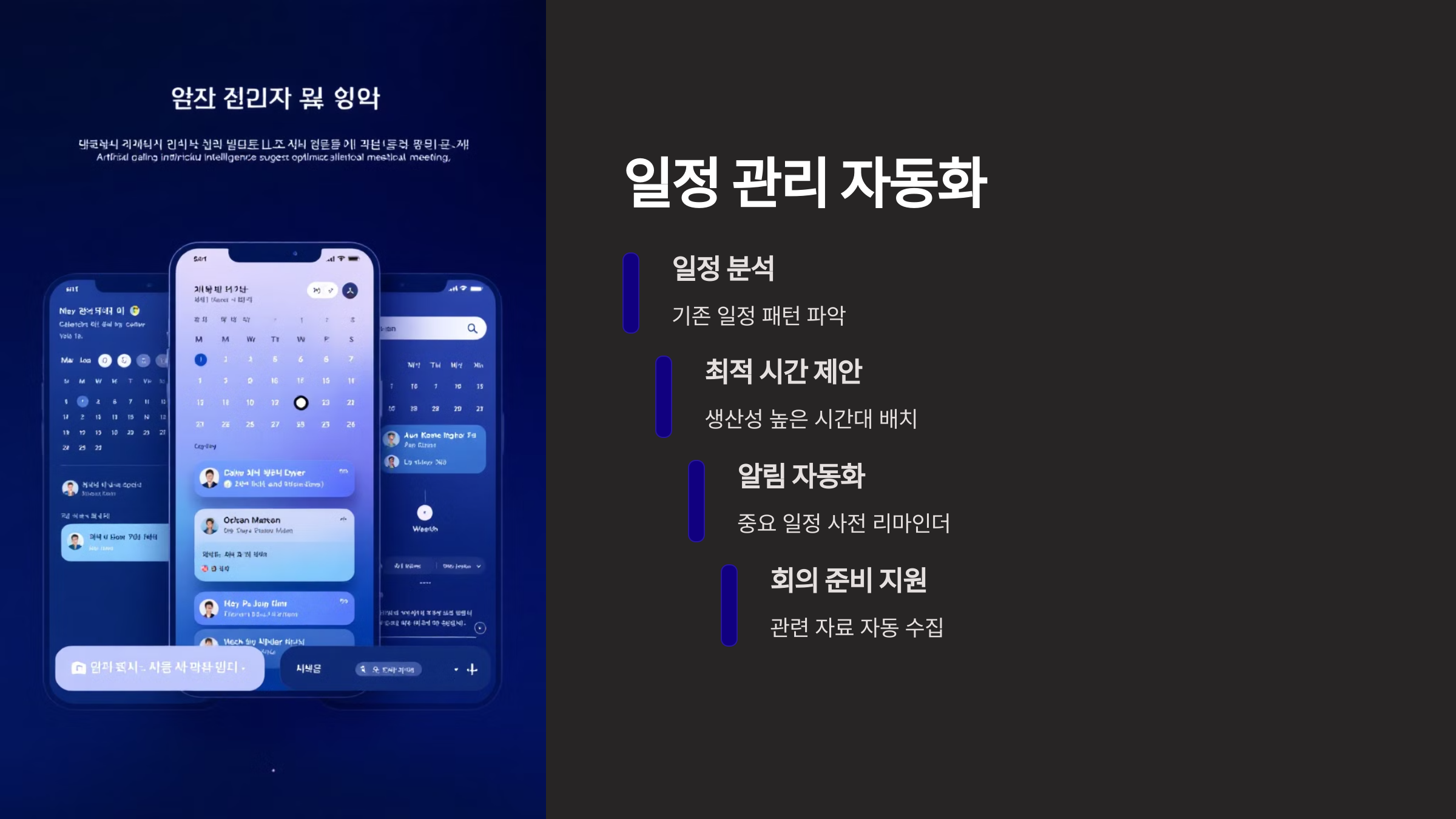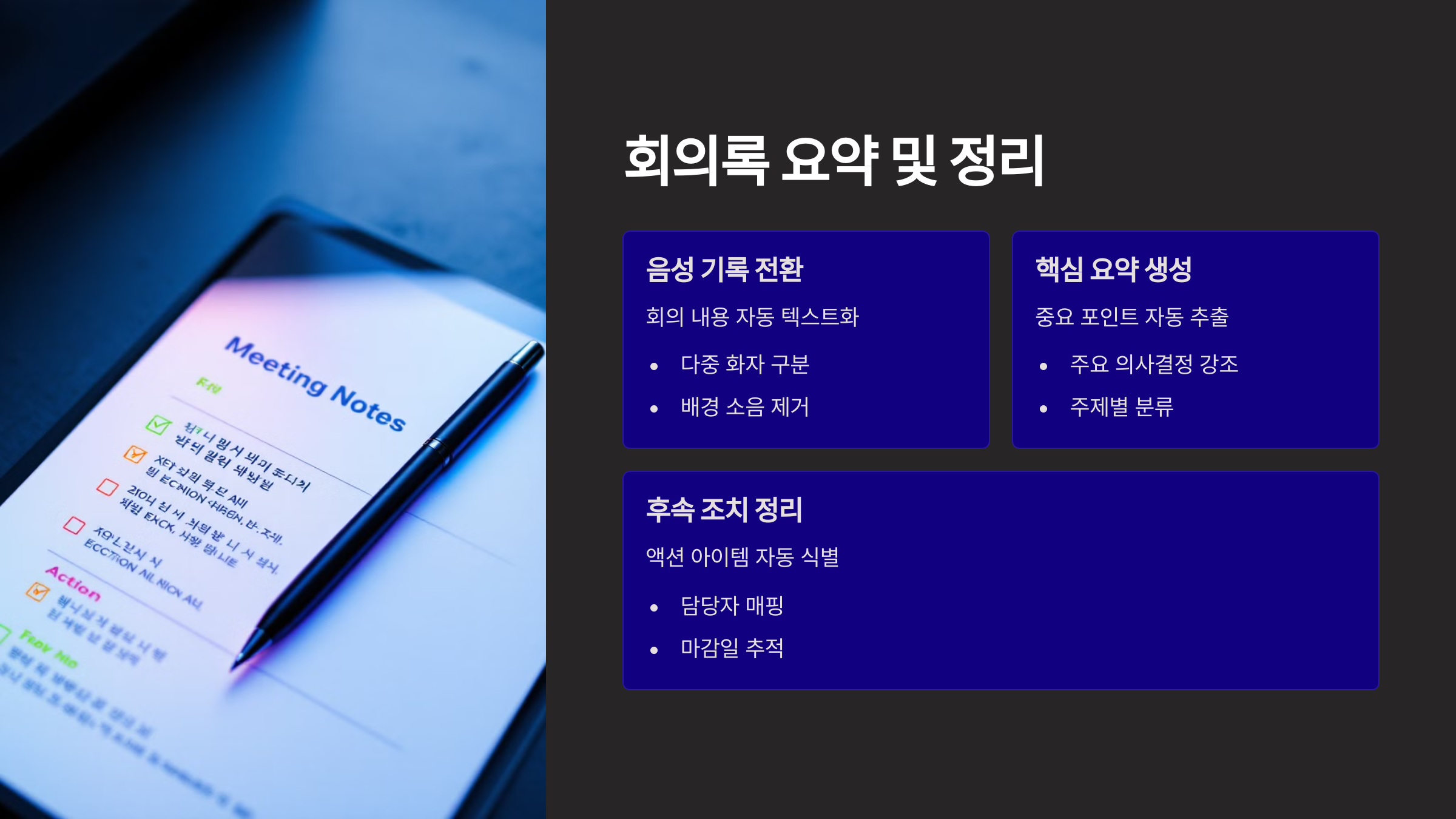 “이 회의 내용을 요약해줘”라고 말하면 주요 항목별로 정리해서 표나 글로 만들어줘요. 업무 분담, 진행상황, 다음 회의 일정 등도 문맥에서 파악해 자동으로 정리해주죠.
