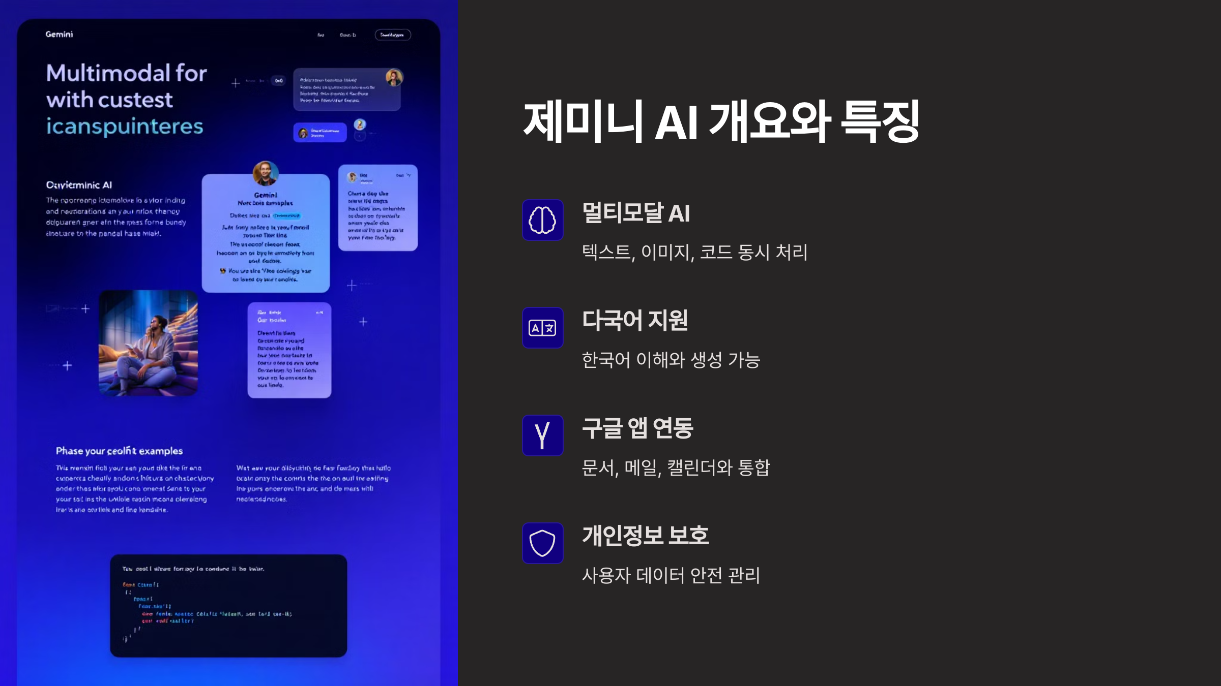 제미니 AI는 구글이 만든 차세대 인공지능 서비스로, 텍스트, 이미지, 코드, 오디오 등 다양한 데이터를 동시에 이해하고 처리할 수 있는 멀티모달 기반의 AI예요. 기존의 텍스트 중심 AI를 넘어서 다양한 업무 상황에 실질적으로 도움을 줄 수 있도록 설계되었죠.