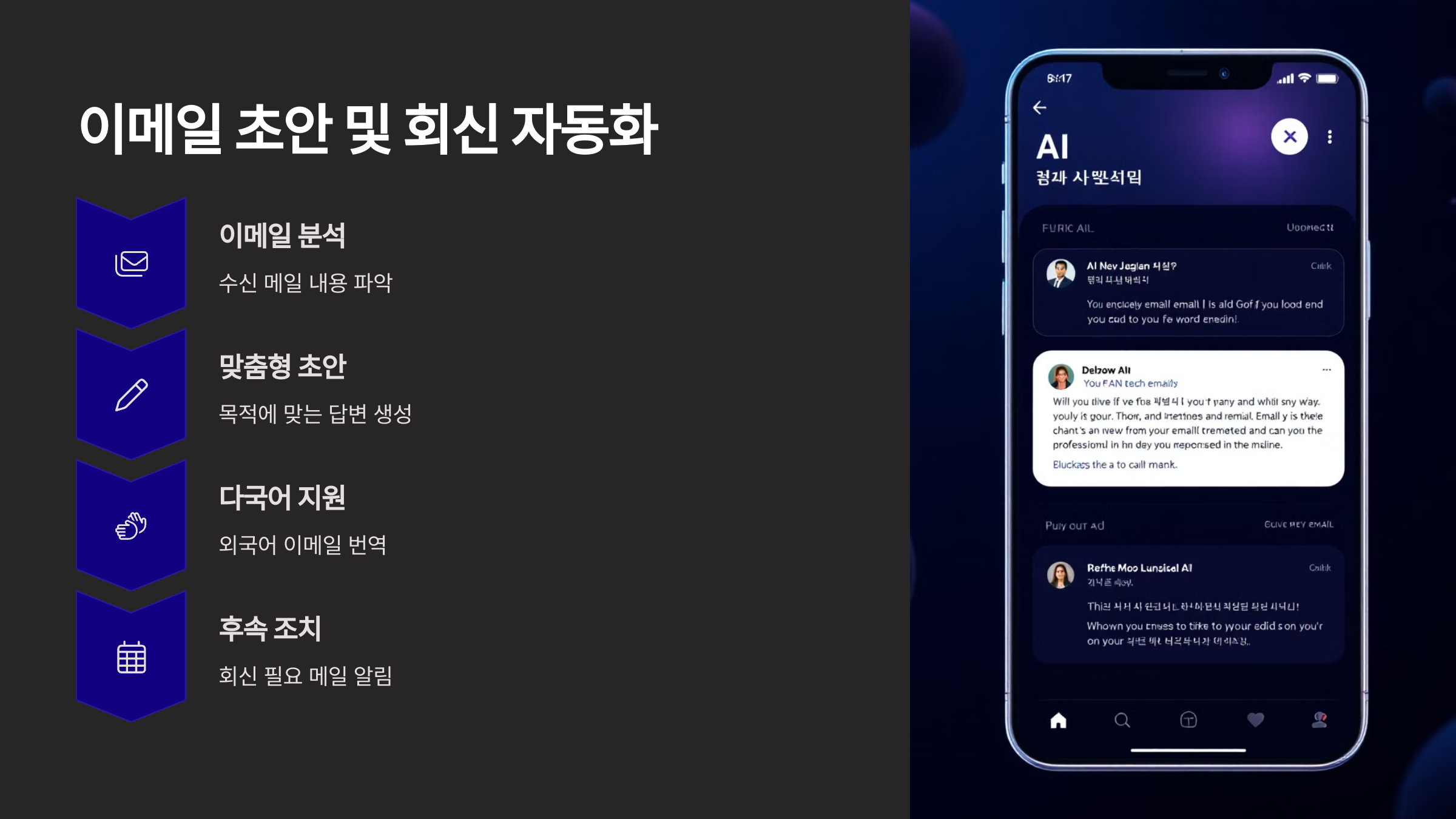 메일 제목을 작성하거나, 요점을 정리해주는 것도 아주 유용한 기능이에요. 여러 메일을 하나로 요약해 주거나, 회신할 내용을 자동으로 제안해주는 기능도 있어요.