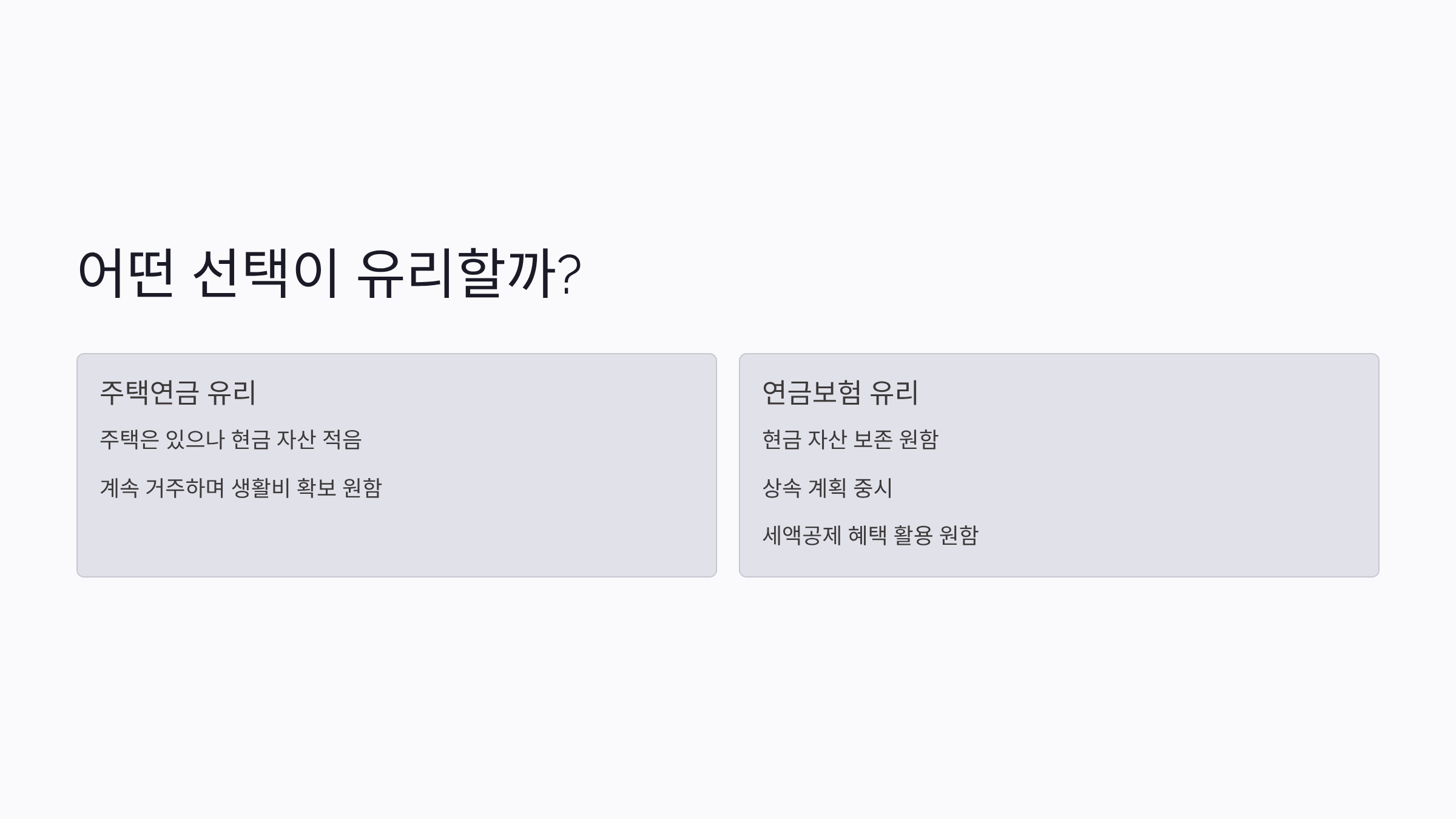 🏠 주택연금이 유리한 경우: - 주택은 있지만 현금 자산이 적은 경우 - 계속 거주하면서 생활비를 확보하고 싶은 경우 - 무주택 자녀에게 주택 상속 필요성이 낮은 경우