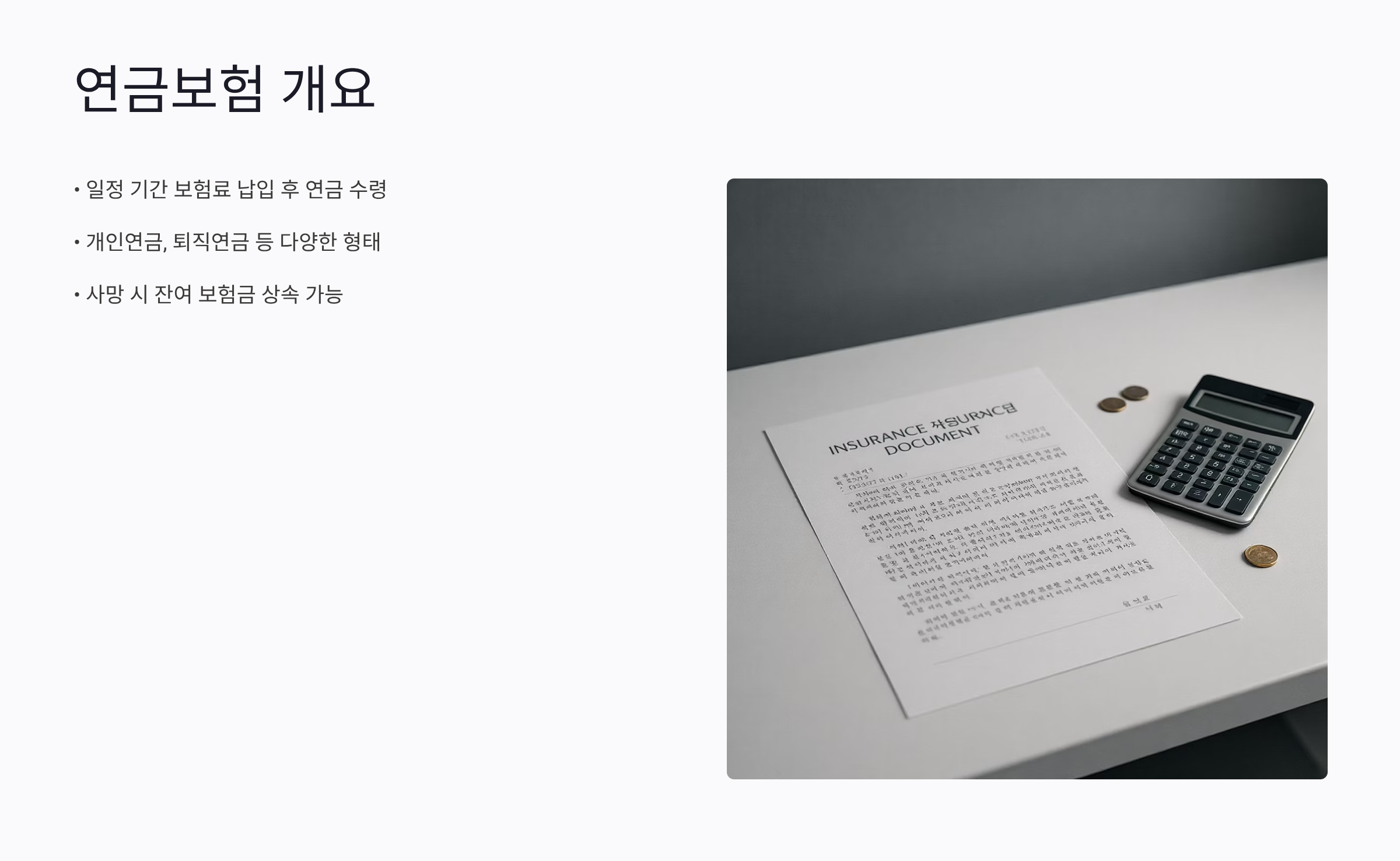 원금 보장 여부, 수익률, 세제 혜택 등 조건이 다양해요. 계약자가 사망하면 잔여 보험금이 상속되며, 자산 형태를 유지할 수 있는 게 주택연금과 다른 점이에요.