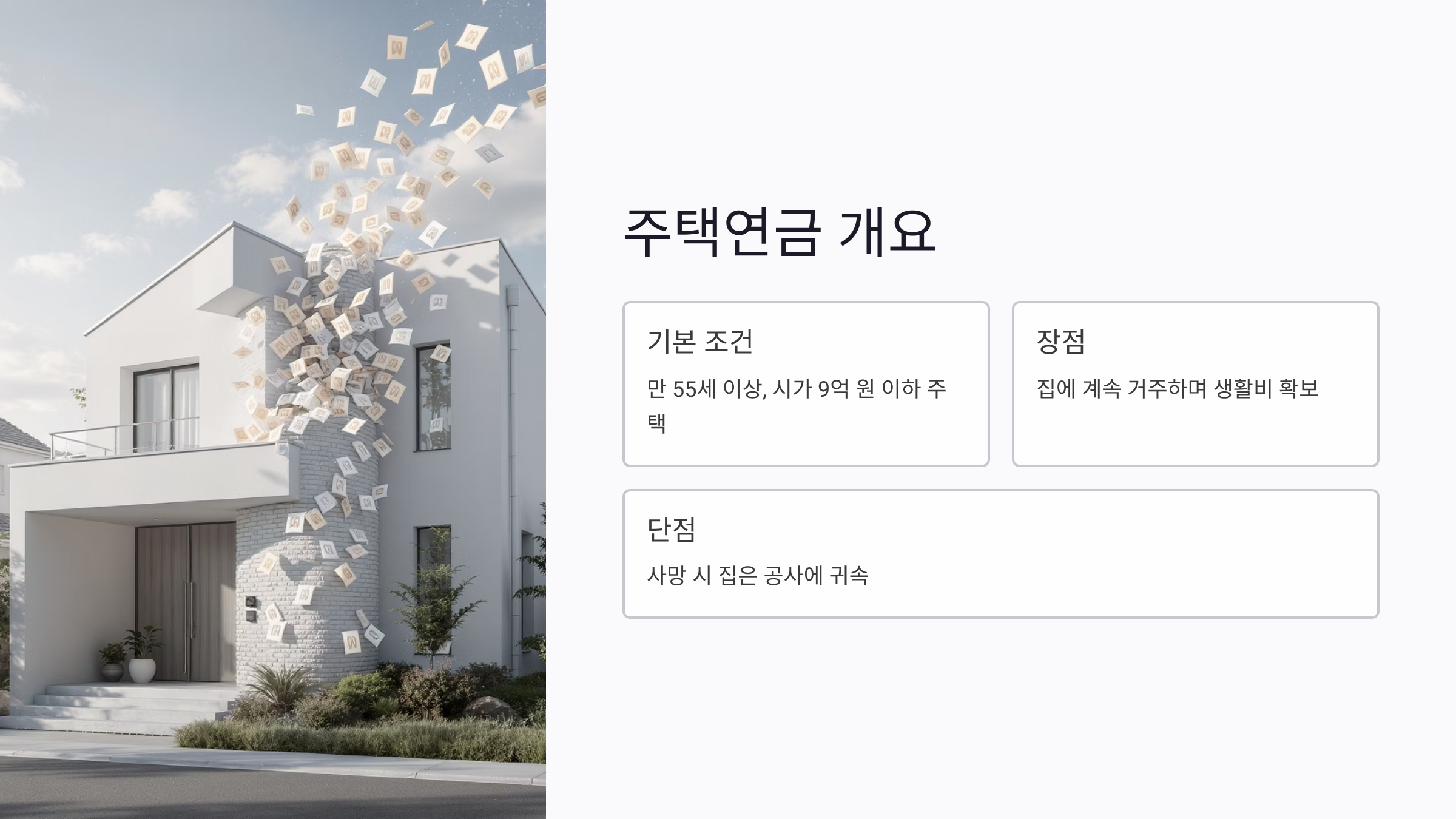 주택연금은 집을 담보로 맡기고 평생 또는 일정 기간 동안 매달 연금을 받는 제도예요. 한국주택금융공사가 운영하며, 부부 기준 만 55세 이상이고, 주택 가격이 시가 9억 원 이하(2025년 기준)면 신청할 수 있어요.