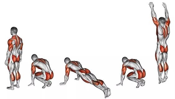 - 방법: 서서 시작하여 스쿼트 자세로 내려간 후, 두 손을 바닥에 대고 다리를 뒤로 보내 플랭크 자세를 취합니다. 다시 다리를 끌어와 점프하며 일어섭니다.