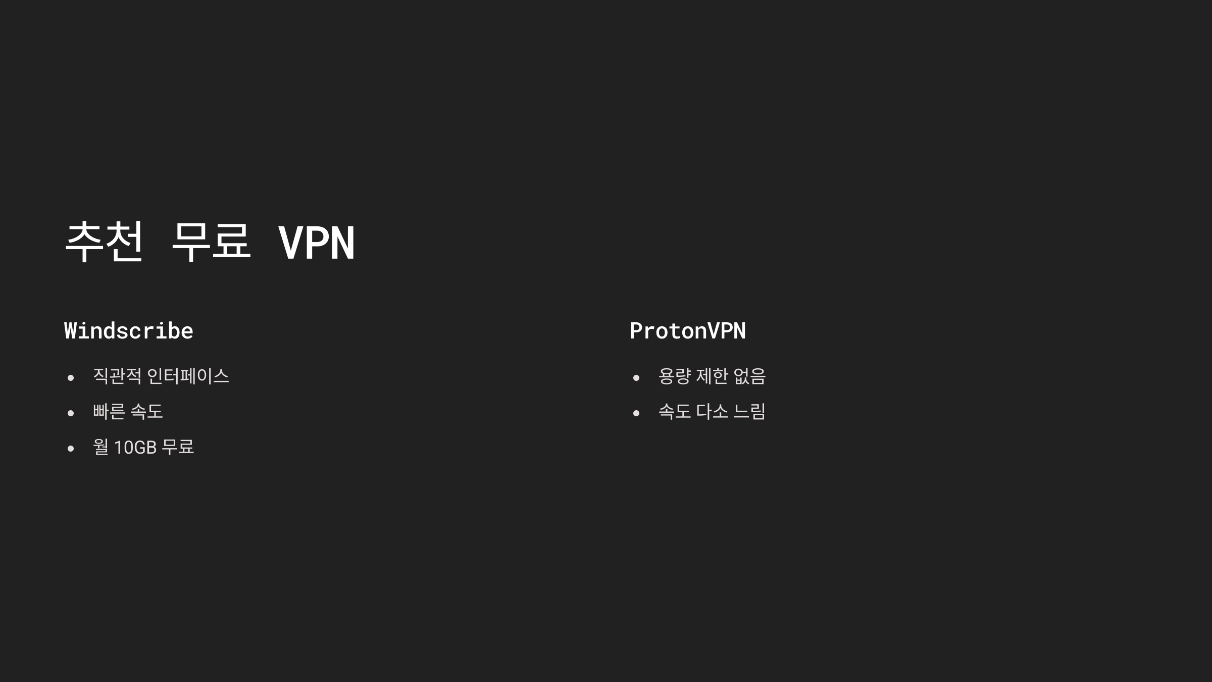 - ✔️ ProtonVPN: 용량 제한 없음, 속도 다소 느림