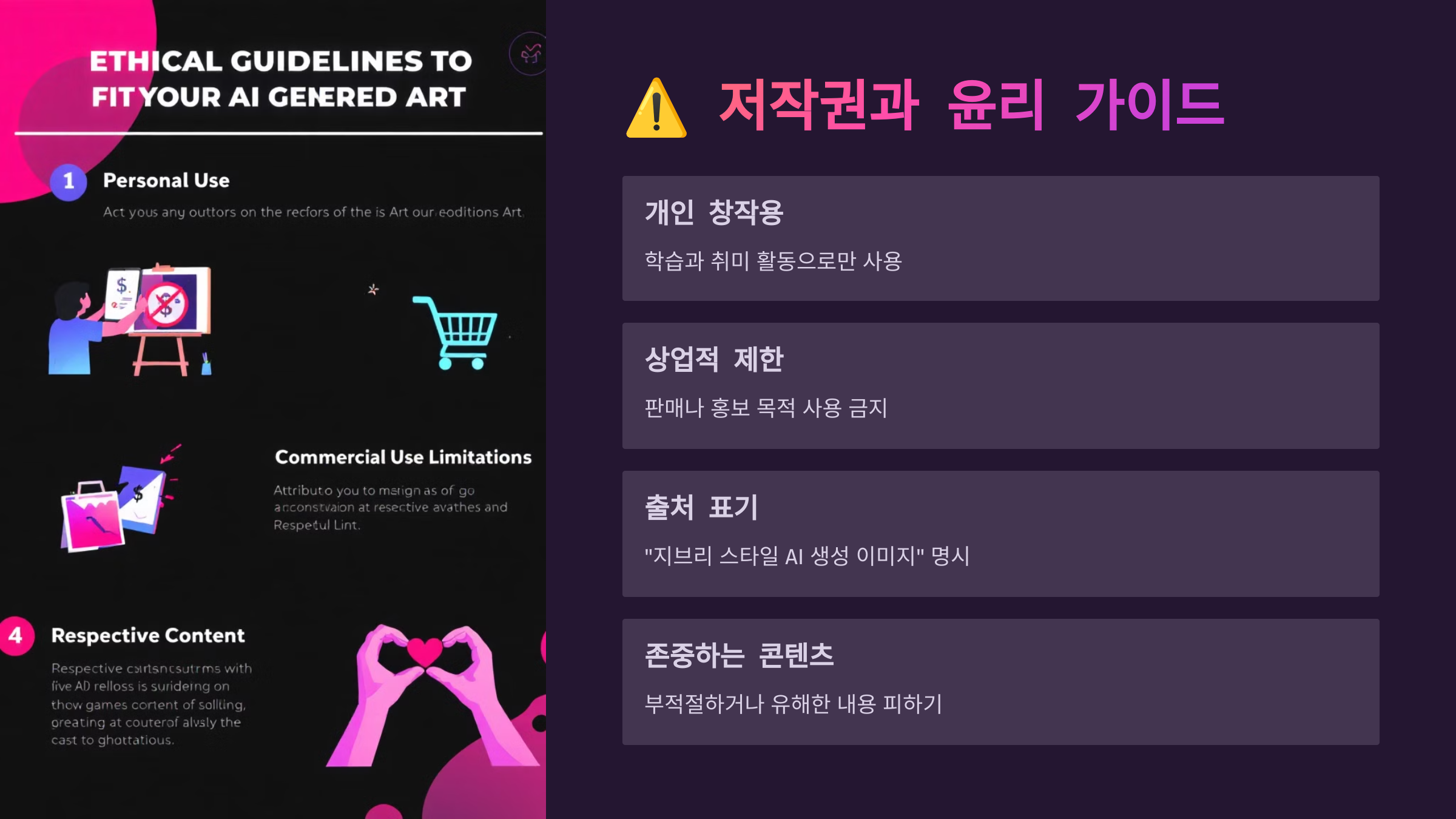 AI 이미지 생성은 놀라운 도구지만, 사용할 때는 저작권과 윤리적인 부분도 반드시 고려해야 해요. 특히 ‘지브리’는 등록된 상표이기 때문에, “지브리”라는 단어 자체를 직접 사용하거나 캐릭터를 복제하는 건 문제가 될 수 있어요.