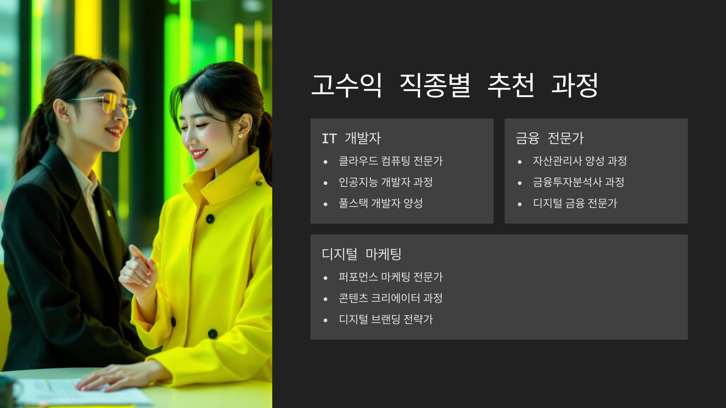 지금부터는 수강 후 실제 취업, 프리랜서 활동, 창업으로 연결되기 쉬운 ‘고소득 직종’을 기준으로 강력 추천드리는 내일배움카드 과정들을 소개할게요!