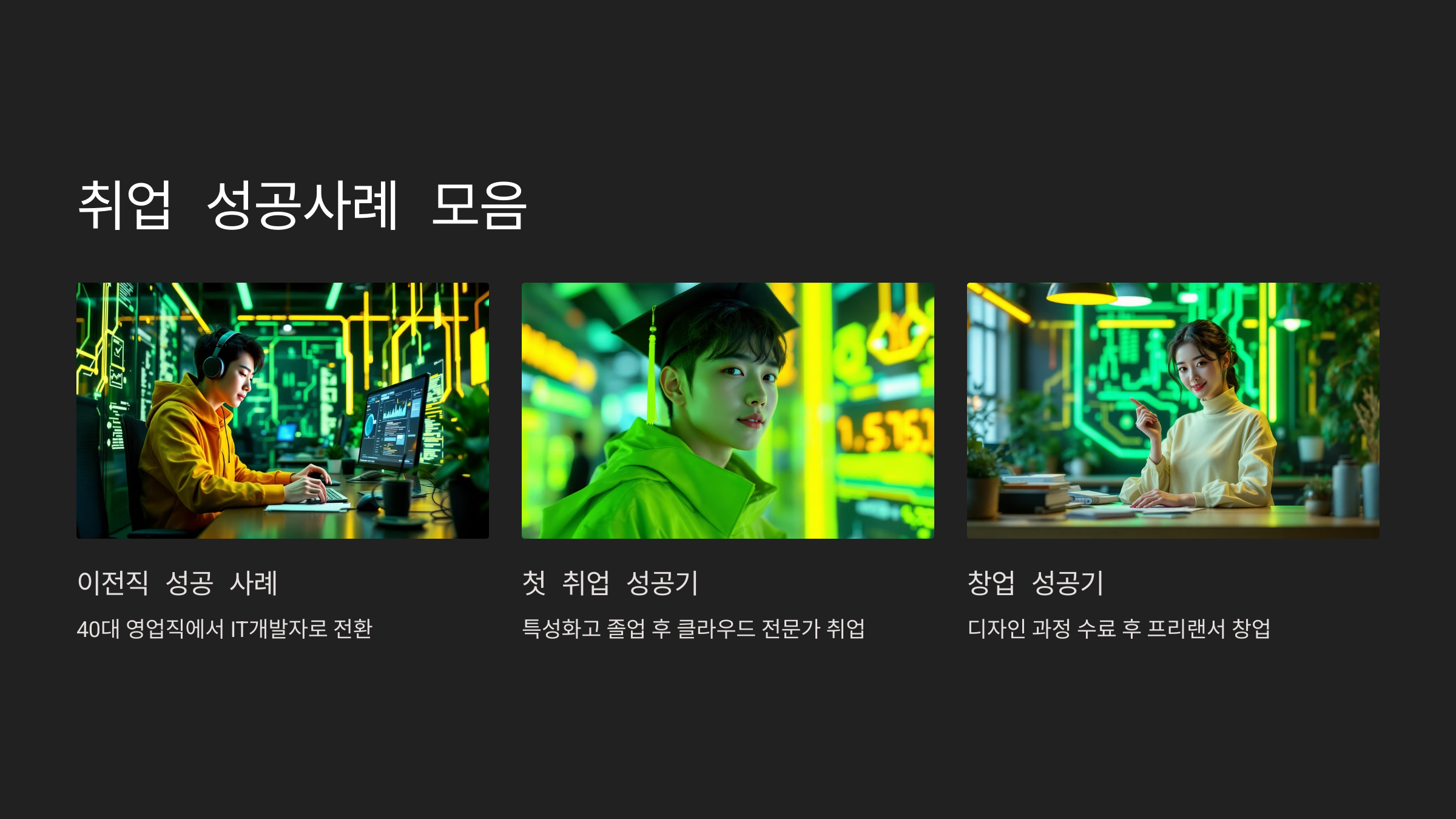 많은 수강생들이 내일배움카드를 통해 인생의 제2막을 열었어요. 경단녀에서 피부관리사로, 비전공자에서 회계사무직으로, 평범한 직장인이 퇴사 후 트레이너로 전직한 사례까지! 꿈은 선택이 아니라 ‘준비’에서 시작된다는 걸 보여주는 이야기들이죠.