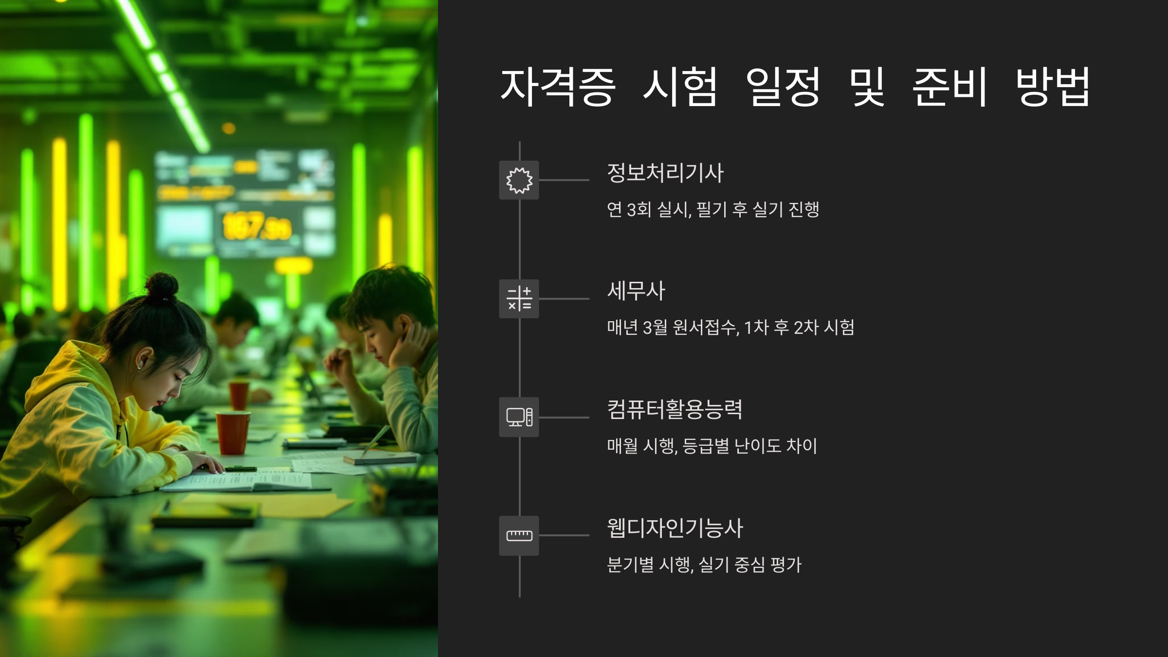 준비 방법으로는 ‘수업 복습 + 실기 훈련’이 가장 중요해요. 실기 중심 자격증은 학원 수업에 충실히 참여하는 것만으로도 합격률이 높아지고요, 필기시험은 모의고사 위주로 연습하면 충분하답니다.