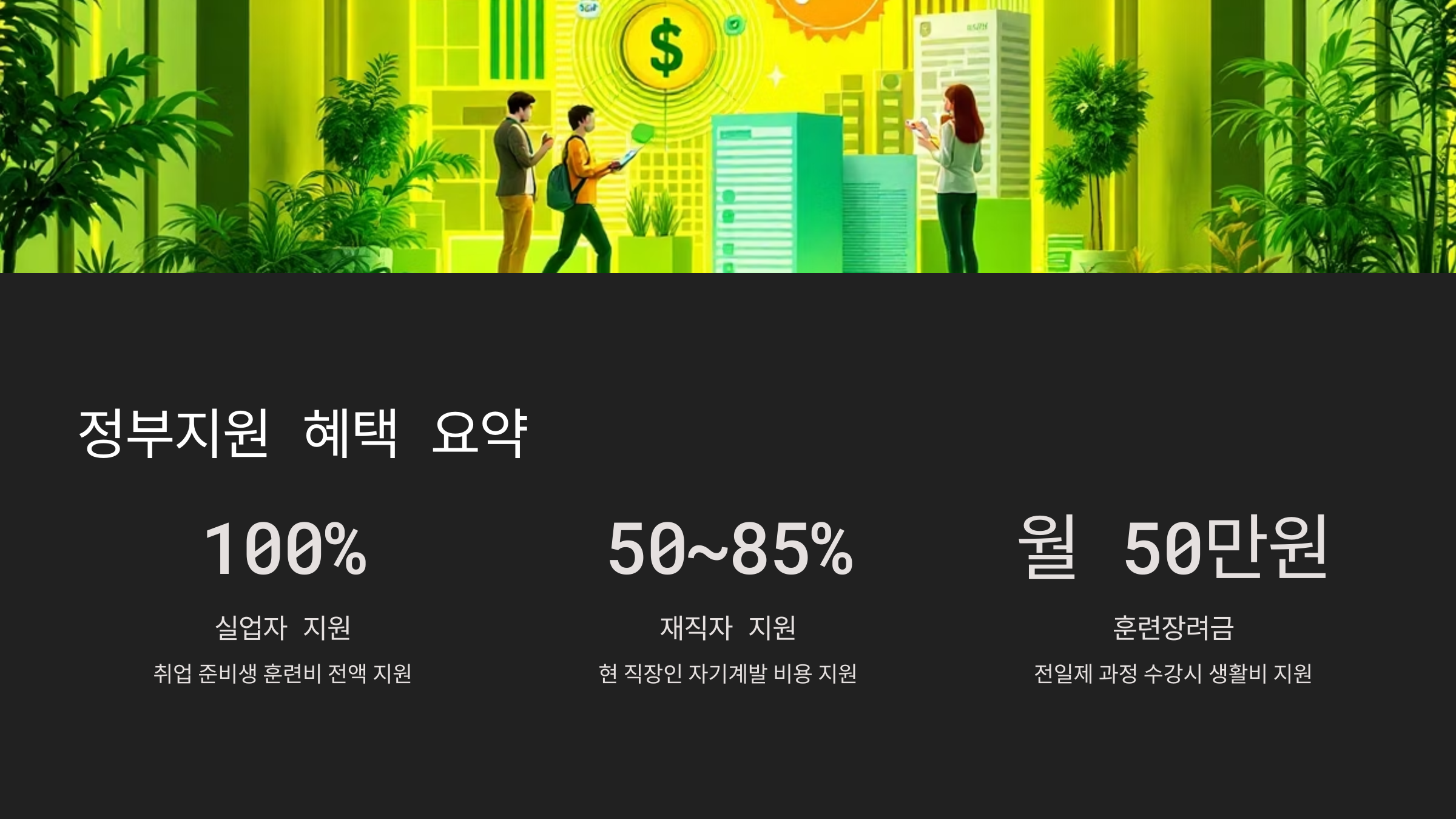 | 훈련비 지원 | 최대 500만 원 / 과정별 100% 또는 80% 지원 |