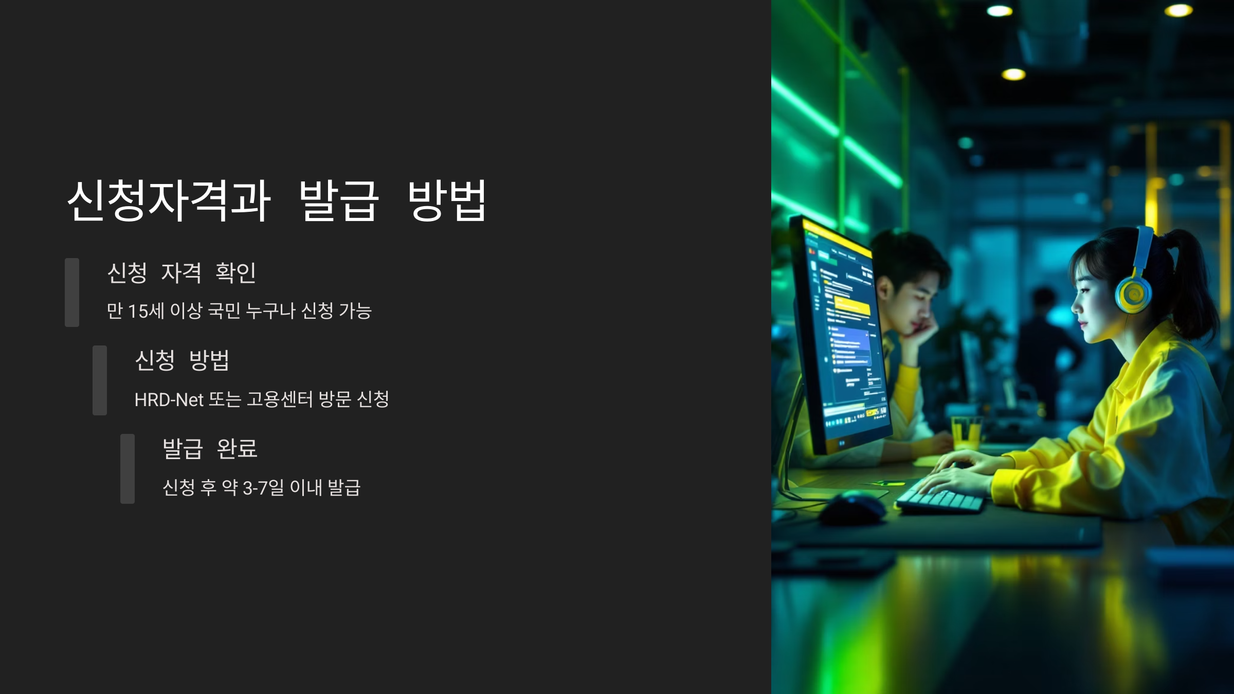 신청 방법도 간단해요. 먼저 HRD-Net에 회원가입 후, ‘국민내일배움카드 신청’ 메뉴에서 본인 인증과 상담 예약을 진행하면 돼요. 이후 온라인 사전 교육을 듣고, 상담사와 1:1 진행을 거친 뒤 최종 카드가 발급된답니다! 💳