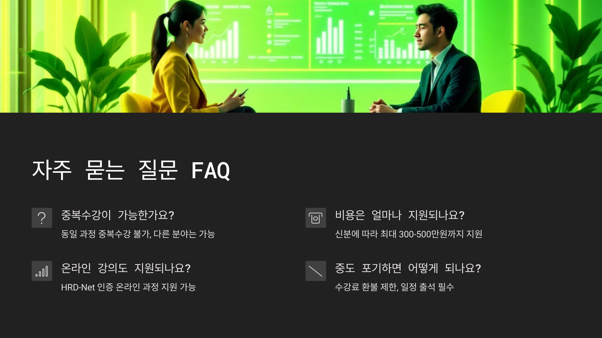 게다가 취업취약계층이나 저소득층, 청년, 경력단절여성 등은 전액 무료 과정도 많아요. 수업료 걱정 없이, 오히려 수강 중 훈련장려금까지 받을 수 있어요. 정부가 열심히 배우는 여러분을 응원하고 있다는 뜻이겠죠! 💡