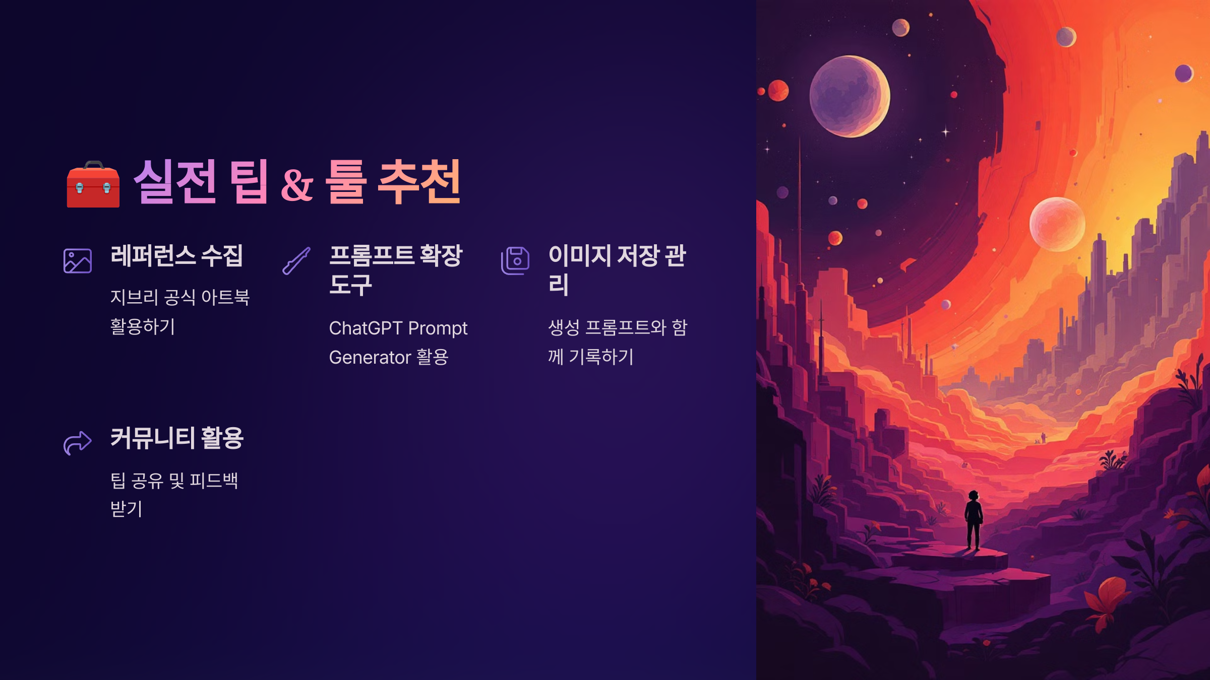 - 3. 프롬프트는 구체적으로 → 한두 문장보다는 장면 묘사를 디테일하게 풀어야 감성이 살아나요.