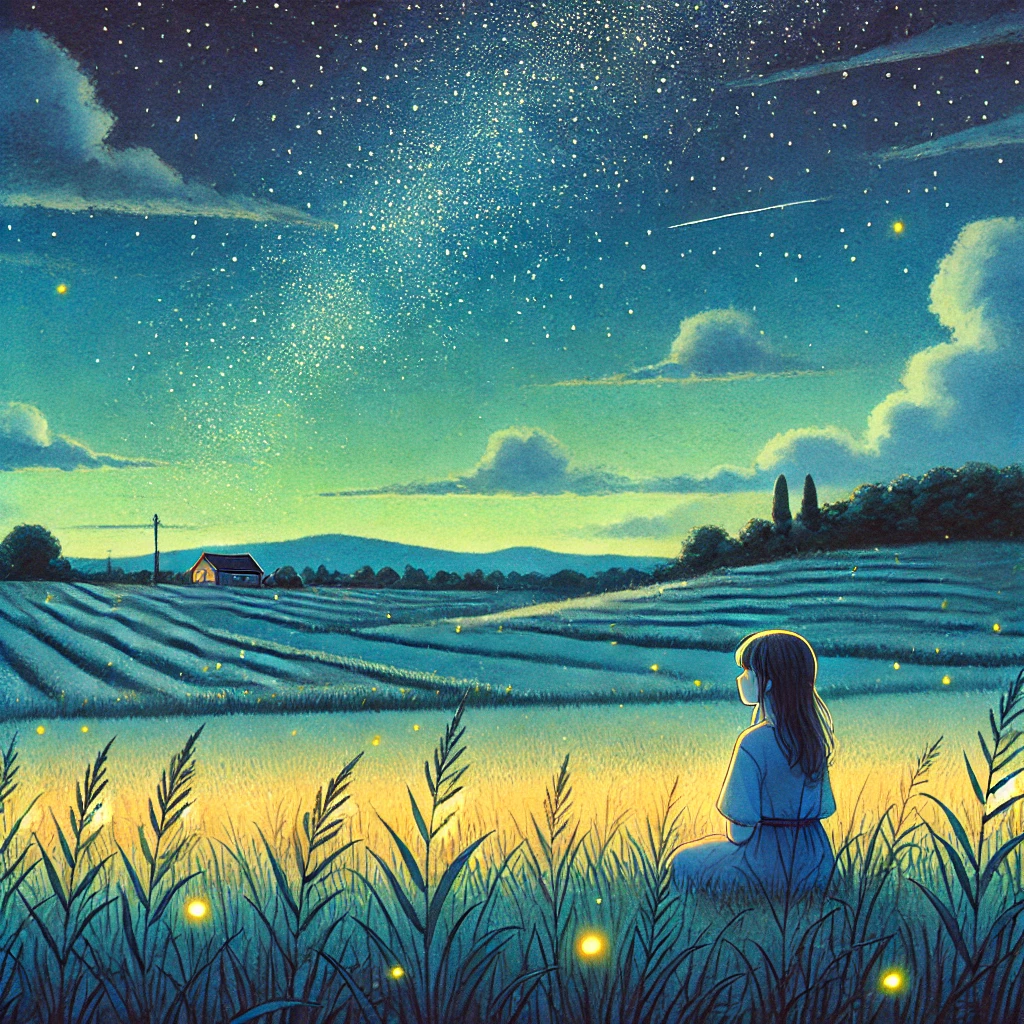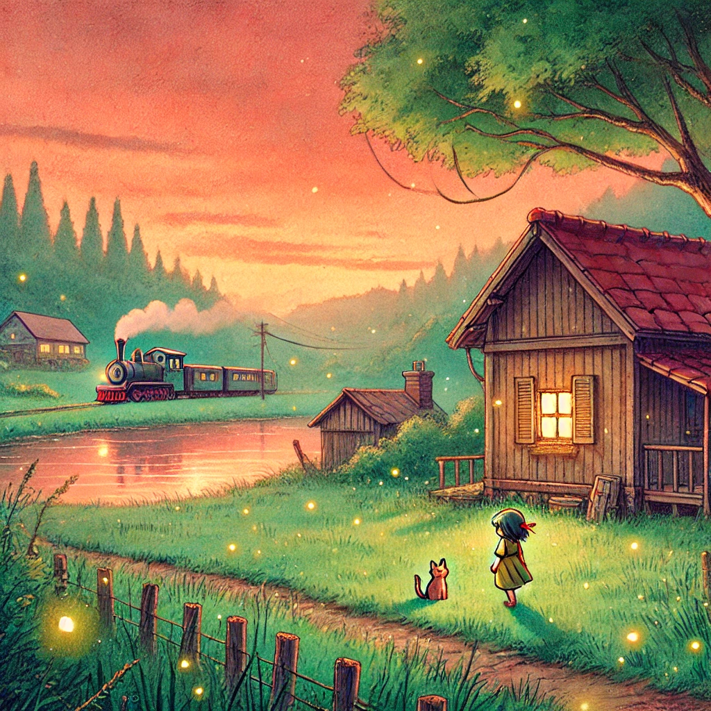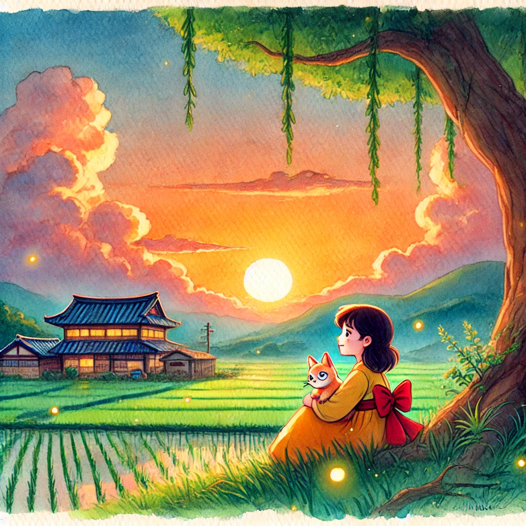 | 시골 저녁 | 해가 지는 시골 마을, 붉은 노을 아래 한 소녀가 고양이와 함께 나무 그늘에 앉아 있다. 따뜻하고 조용한 감성. |