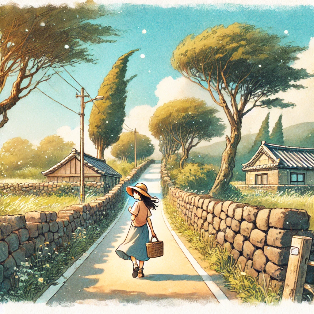 “해질 무렵 제주도의 작은 마을. 빨간 리본을 맨 소녀가 고양이를 안고 조용히 앉아 있다. 배경에는 파란 하늘과 둥근 언덕, 연한 수채화 느낌의 배경. 전체적으로 따뜻하고 감성적인 분위기.”