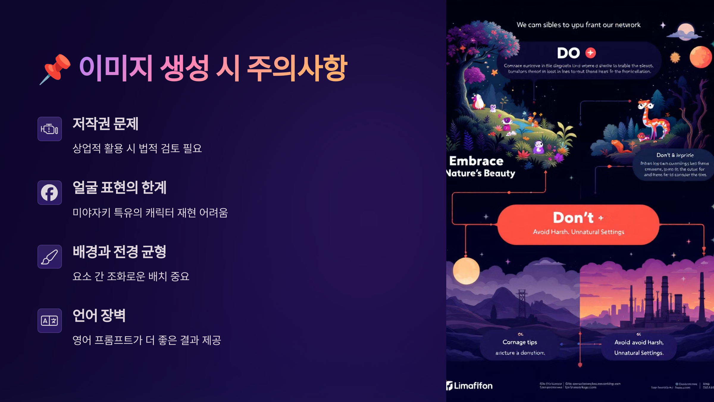 지브리 스타일 이미지를 만들 때, 단순히 프롬프트만 잘 쓴다고 되는 건 아니에요. AI 툴 특성상 조심해야 할 점도 꼭 기억해두면 더 예쁜 결과물을 만들 수 있어요 😊
