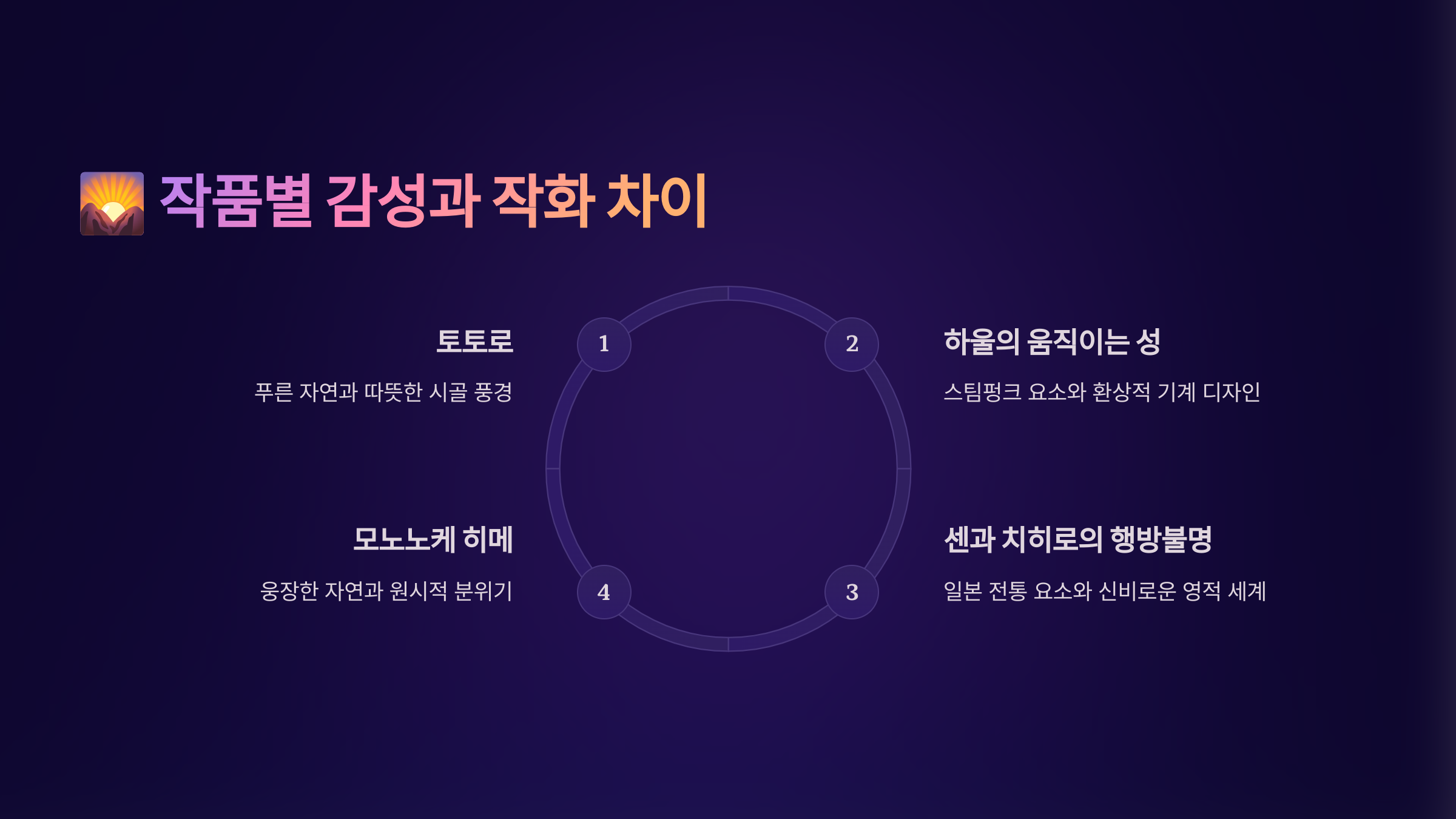 예를 들어 ‘센과 치히로의 행방불명’은 몽환적이고 어두운 분위기, ‘이웃집 토토로’는 초록 초록한 밝은 시골 감성, ‘하울의 움직이는 성’은 유럽풍의 판타지적 요소가 강해요 ✨