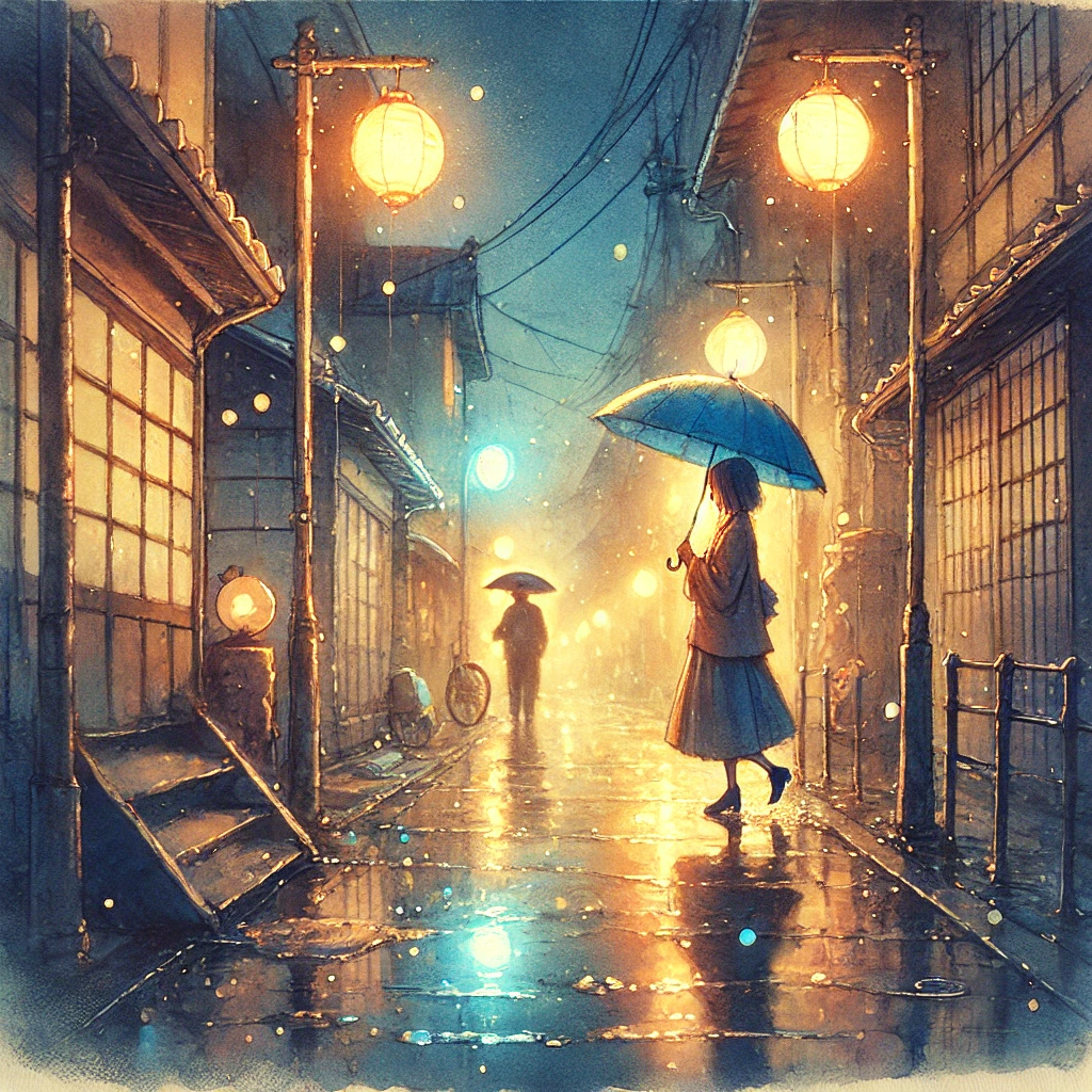 | 비 오는 거리 | 살짝 젖은 골목길. 우산을 들고 걸어가는 두 소녀, 주황빛 가로등과 반짝이는 빗방울. 포근하고 몽환적인 밤. |