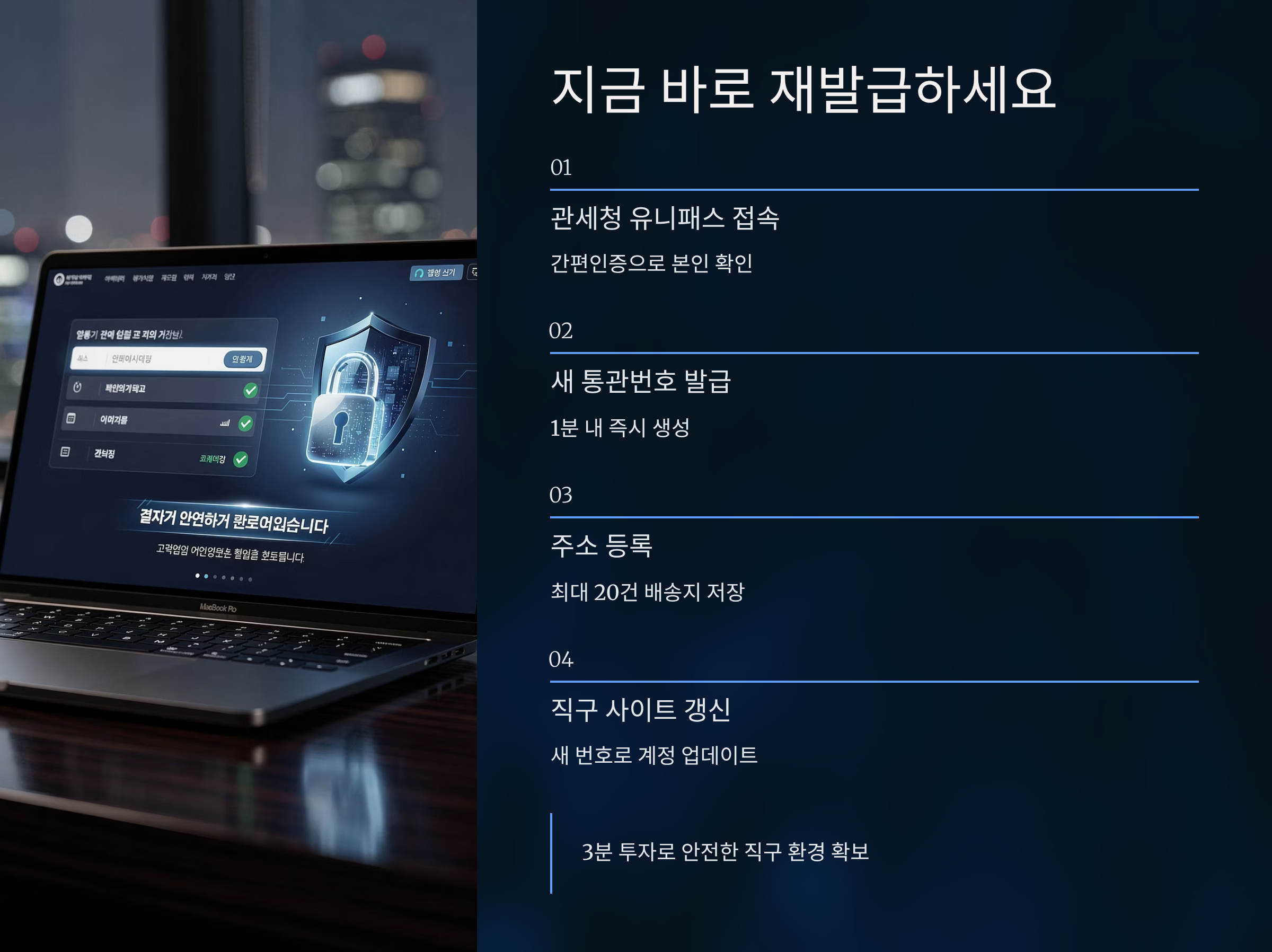 재발급은 기존의 개인통관번호를 버리고, 새로운 번호로 교체하는 작업이에요. 관세청 유니패스에서 본인 인증을 거치면 누구나 1분 내에 새로운 통관번호를 받을 수 있고, 기존 번호는 즉시 폐기 처리됩니다.