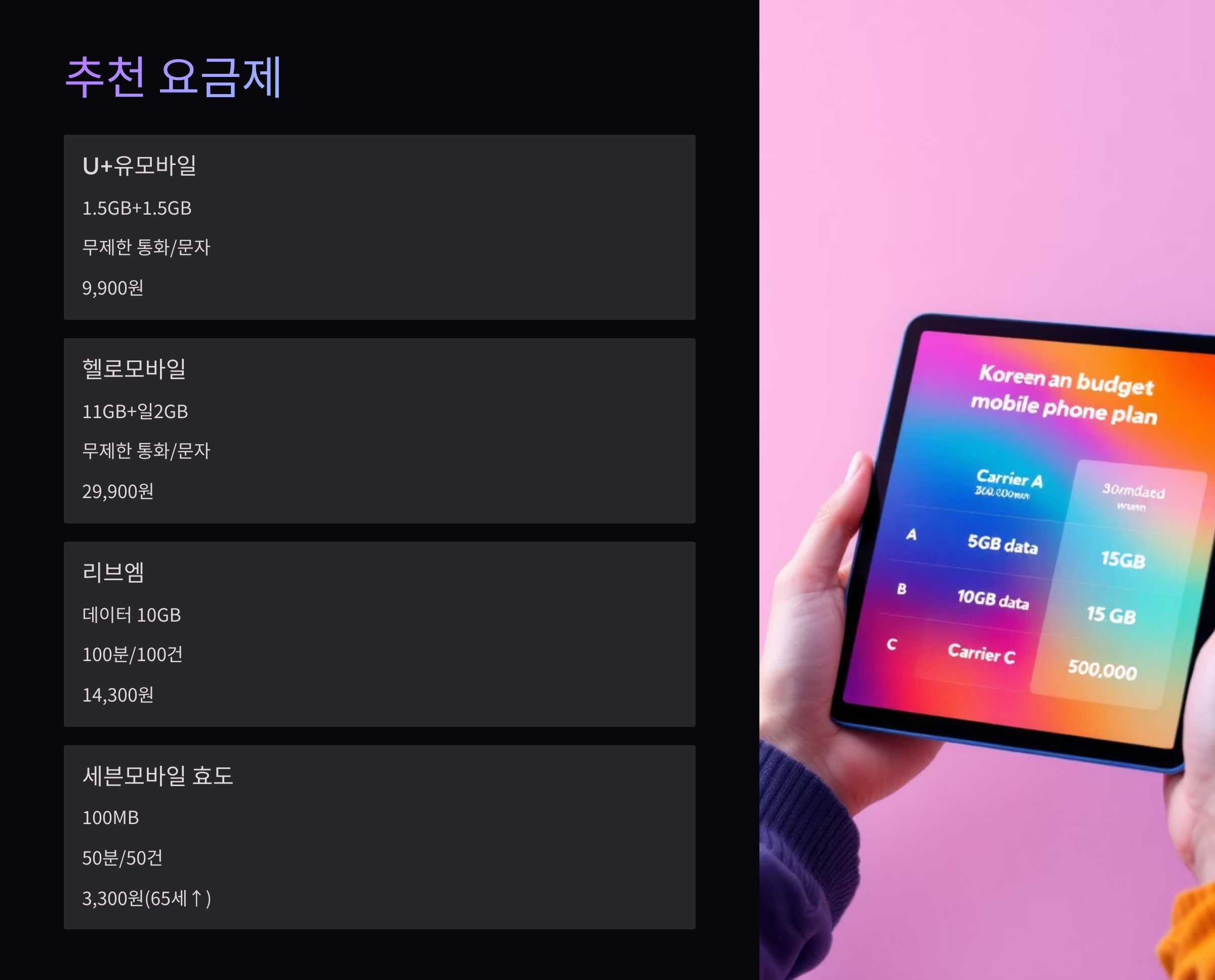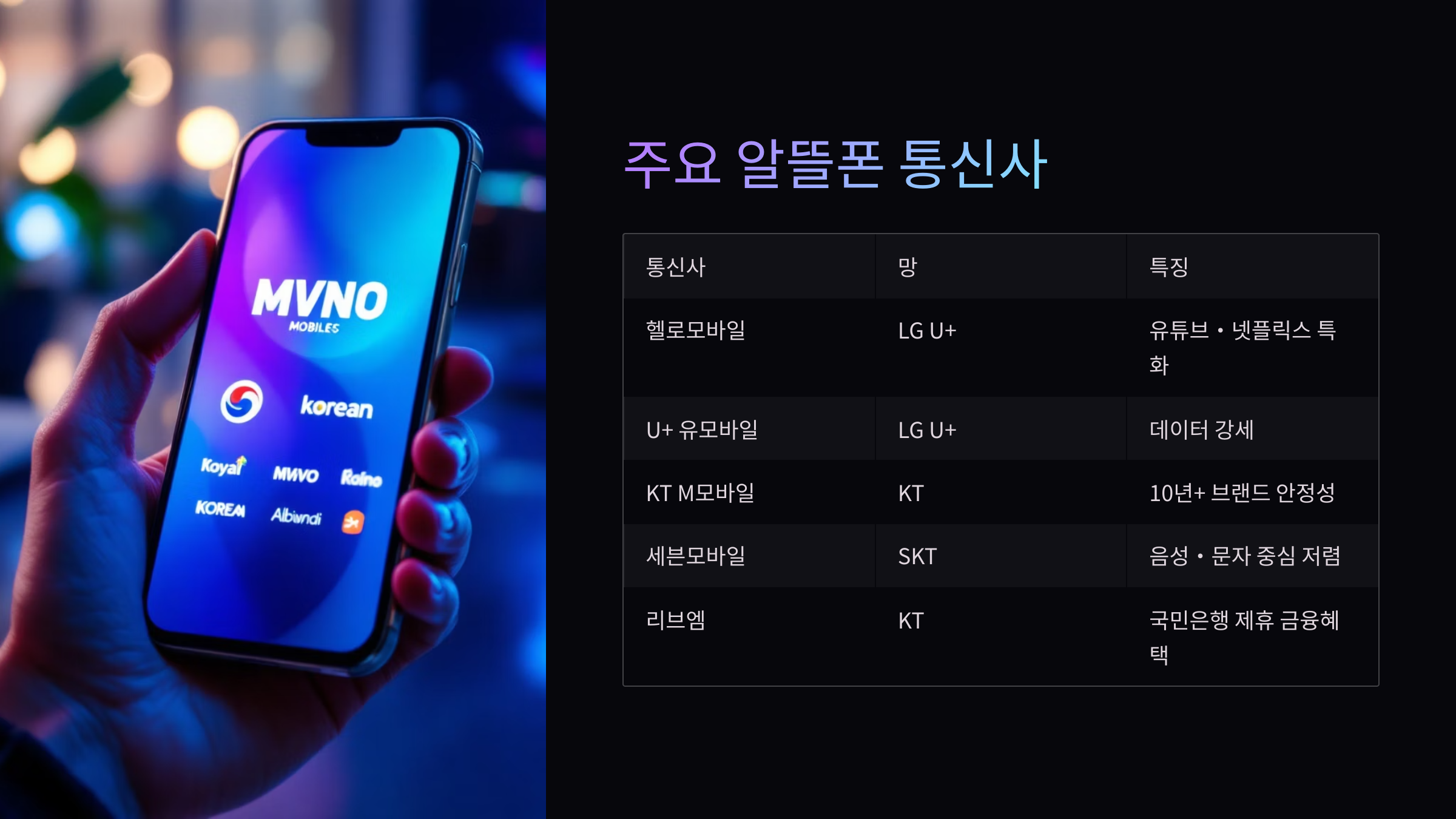 | 헬로모바일 | LG U+ | 유튜브·넷플릭스 특화, 대중적 인기 |